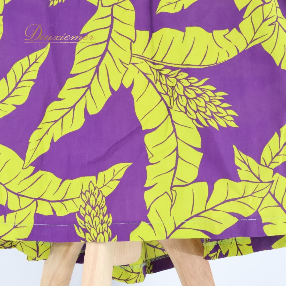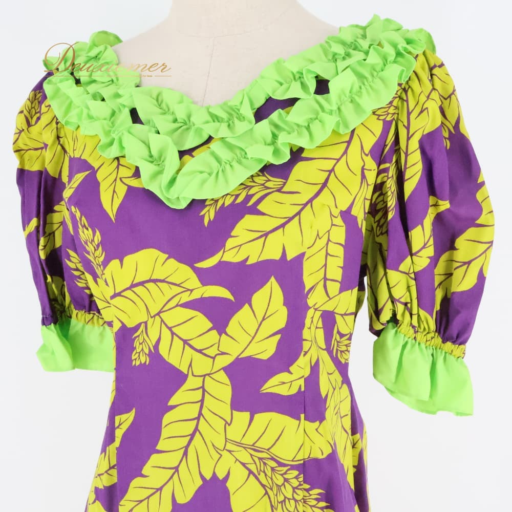 フラダンス 衣装 ワンピース ドレス パープル系 グリーン系 ツーカラー フリル 華やか 鮮やか 目を引く かわいい 大人っぽい 紫 黄緑 ダンス衣装 ハワイアンダンス レディース ハワイアン アロハ ハワイアンプリント フラ ダンス レッスン 練習