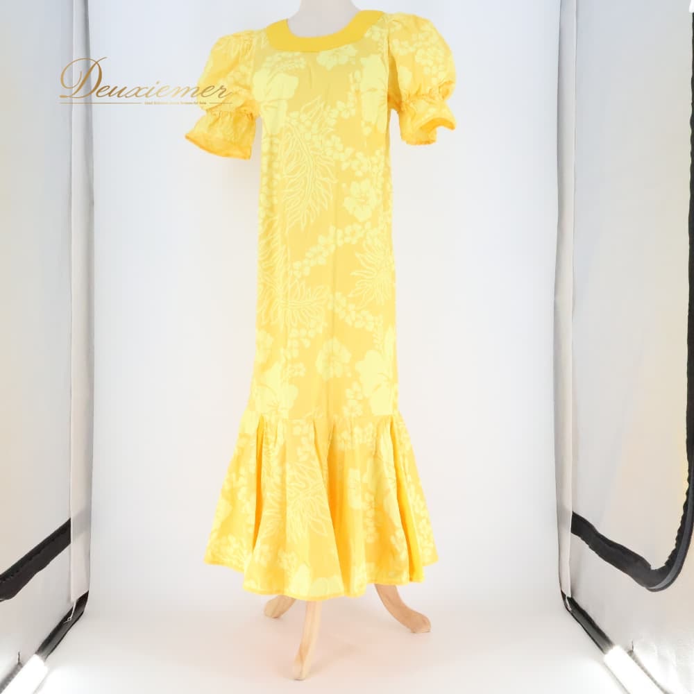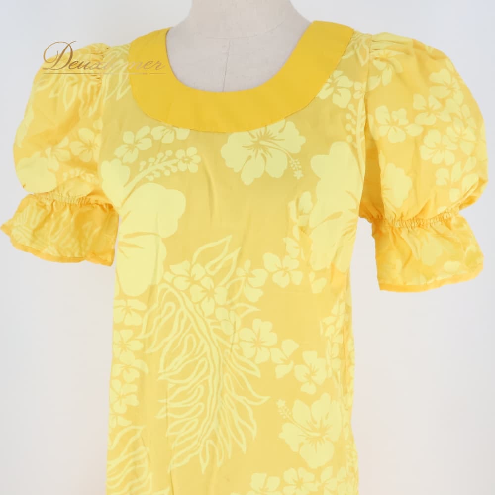フラダンス 衣装 ワンピース ドレス レインボーハワイ イエロー系 Rainbow Hawaii ハワイ製 ワントーン パフスリーブ ハイビスカス柄 レイ柄 ダンス衣装 かわいい 華やか 鮮やか 明るい 黄 レディース ハワイアン アロハ フラ レッスン 練習