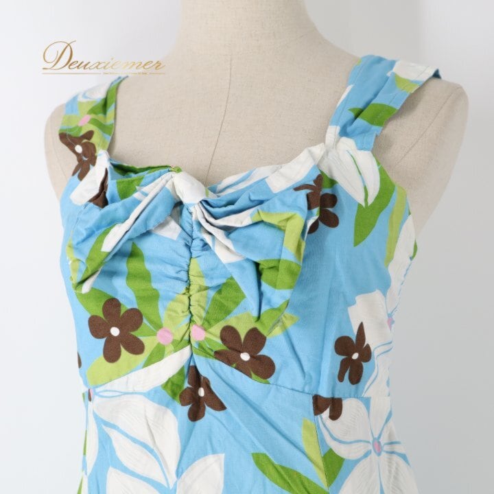 #ハワイアンプリント #ブルーワンピース #リゾートコーデ #夏コーデ #春コーデ #ワンピース #大人可愛い #リボンデザイン #胸元リボン #背面ファスナー #コットンブレンド #ポリエステル #オシャレ女子 #きれいめカジュアル #カジュアルワンピ #旅行コーデ #お出かけ #海コーデ #ENUTSU