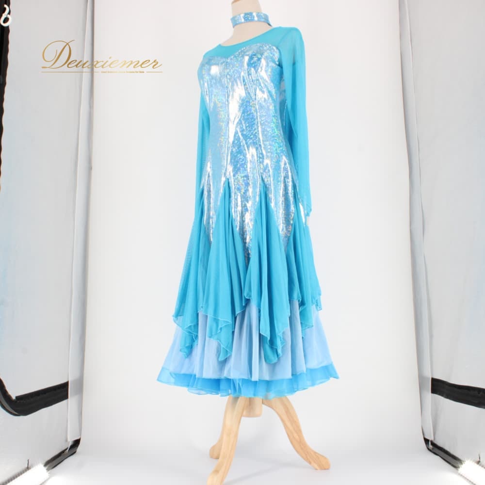 社交ダンス 衣装 スタンダード ドレス ワンピース パーティドレス レディース create-sun 水色 ブルー系 シルバー系 チョーカー 長袖 クリエイトサン ライトブルー ブルー くすみブルー シルバー ラメ風 光沢 ワンピースドレス ロング丈 ミモレ丈 ロングスリーブ ストレッチ 伸縮性あり フリル ティアード スカート ボリューム アシンメトリー風 大きく広がる裾 ダンス衣装 発表会 演奏会 舞台 社交ダンス用ドレス パーティー用ドレス 練習着 女性用 婦人用