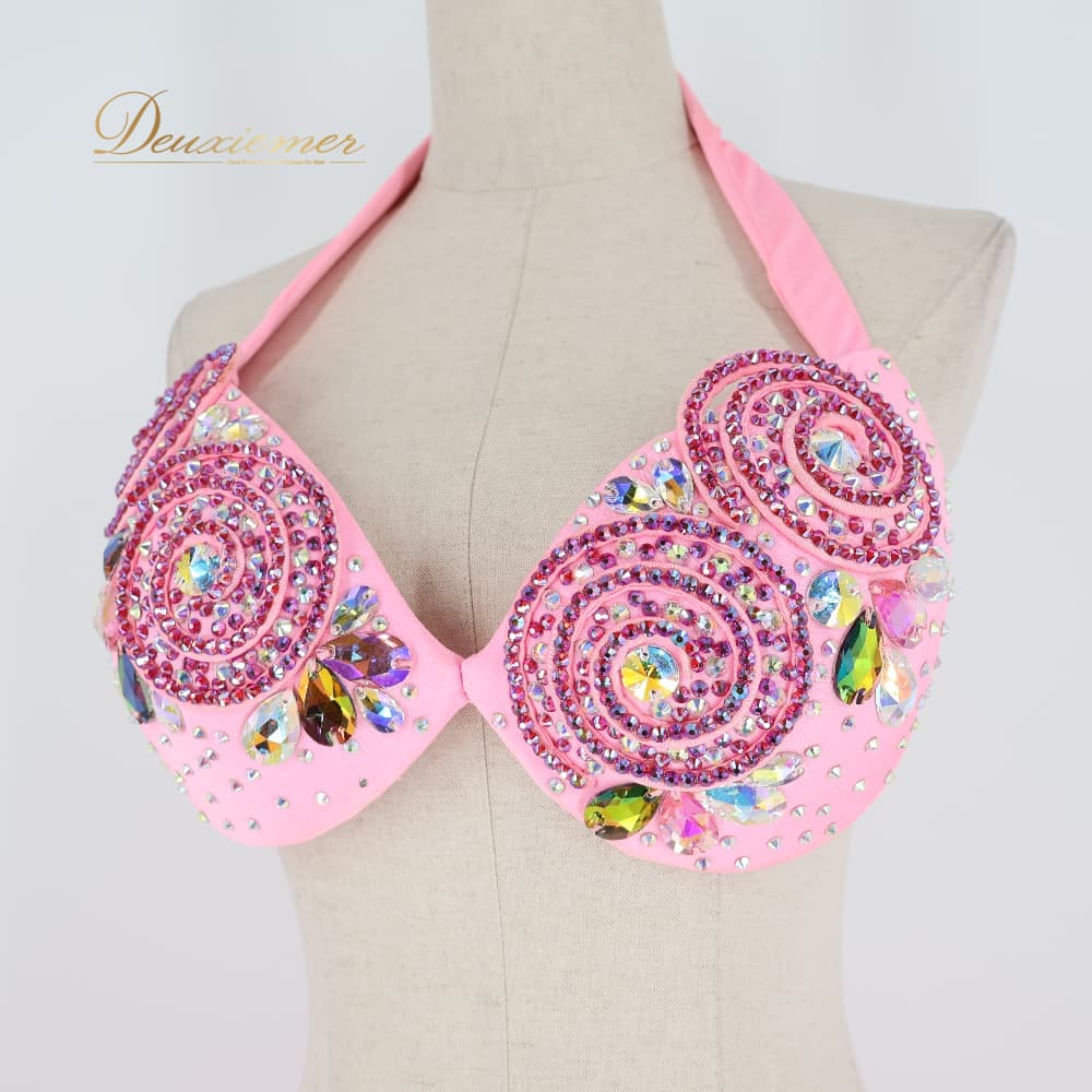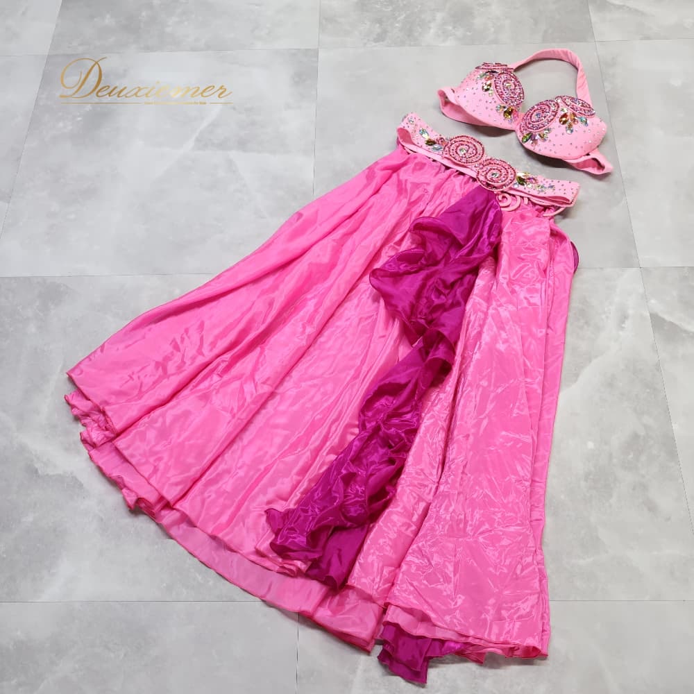 ベリーダンス オリエンタル 衣装 上下セット ピンク系 ポリーナ POLINA トップス スカート ベルト ラインストーン 装飾 豪華 明るい かわいい 華やか ダンス衣装 イベント ステージ 鮮やか スリット フリル