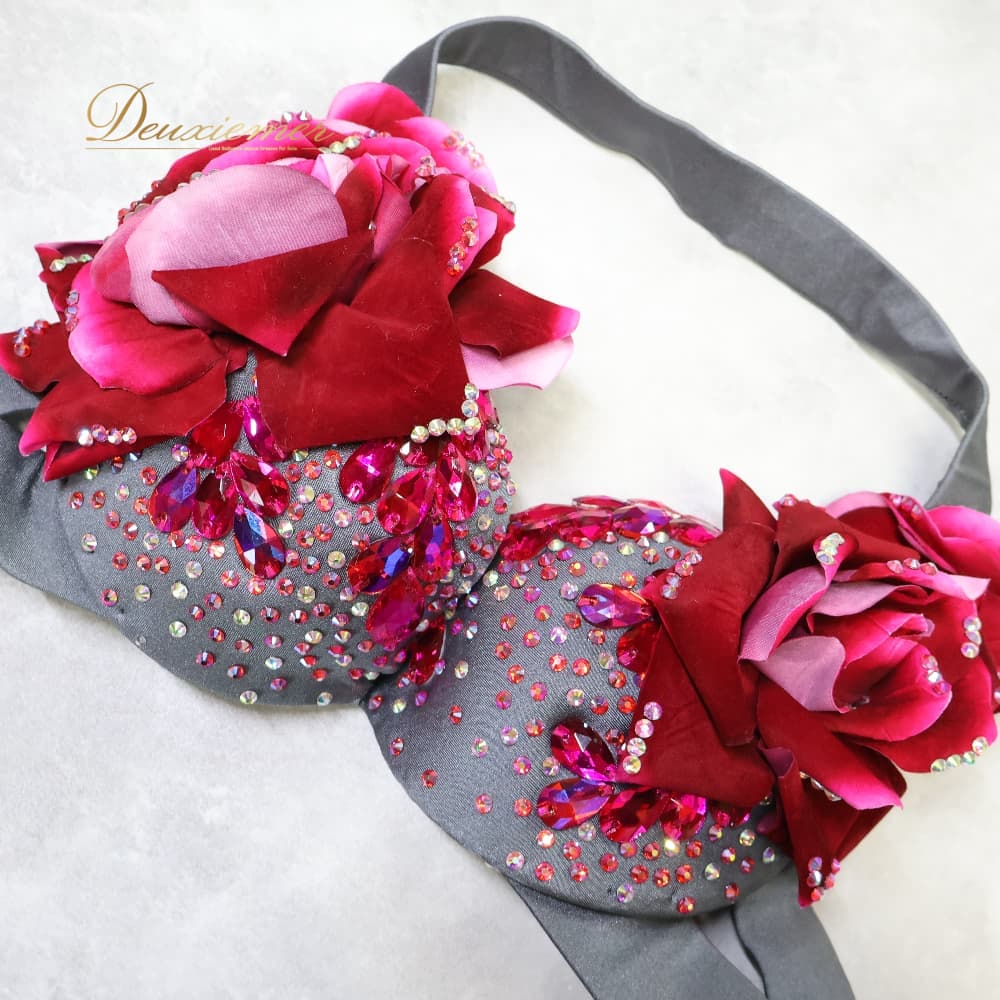 ベリーダンス オリエンタル 衣装 上下セット グレイ系 ポリーナ POLINA トップス スカート 花 赤 伸縮 ストレッチ ラインストーン キラキラ 華やか スリット ダンス衣装 イベント ステージ かわいい レッド系 ピンク系