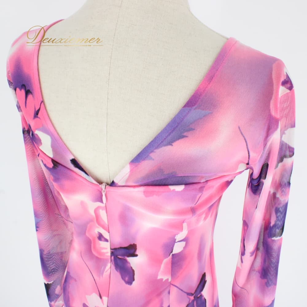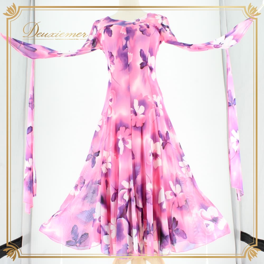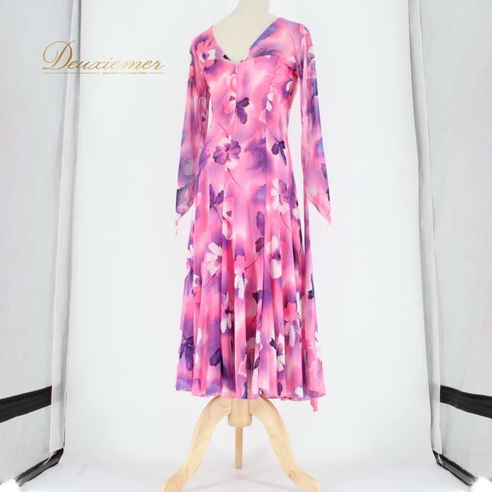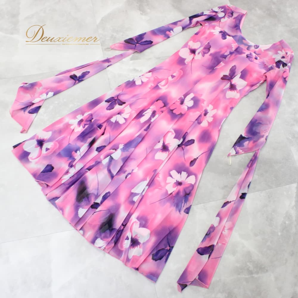 社交ダンス 衣装 スタンダード ドレス ワンピース パーティドレス create-sun 白 紫 ホワイト系 ピンク系 パープル系 フロート 長袖 花柄 ピンク 白系 大人可愛い 華やか ワンピースドレス ロング丈 ミモレ丈風 フレアスカート フレアワンピース フロートスリーブ シフォン風 透け感 ステージ衣装 発表会 コンクール ダンス衣装 競技ダンス 女性用 婦人 きれいめ パーティー 結婚式 二次会 クラブ イベント オシャレ 背面ファスナー 伸縮性あり 胸パッド付き