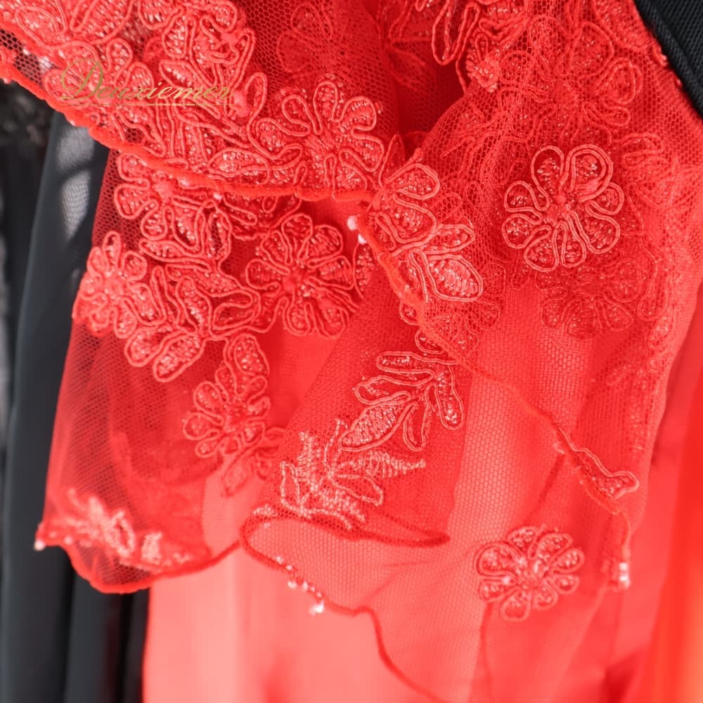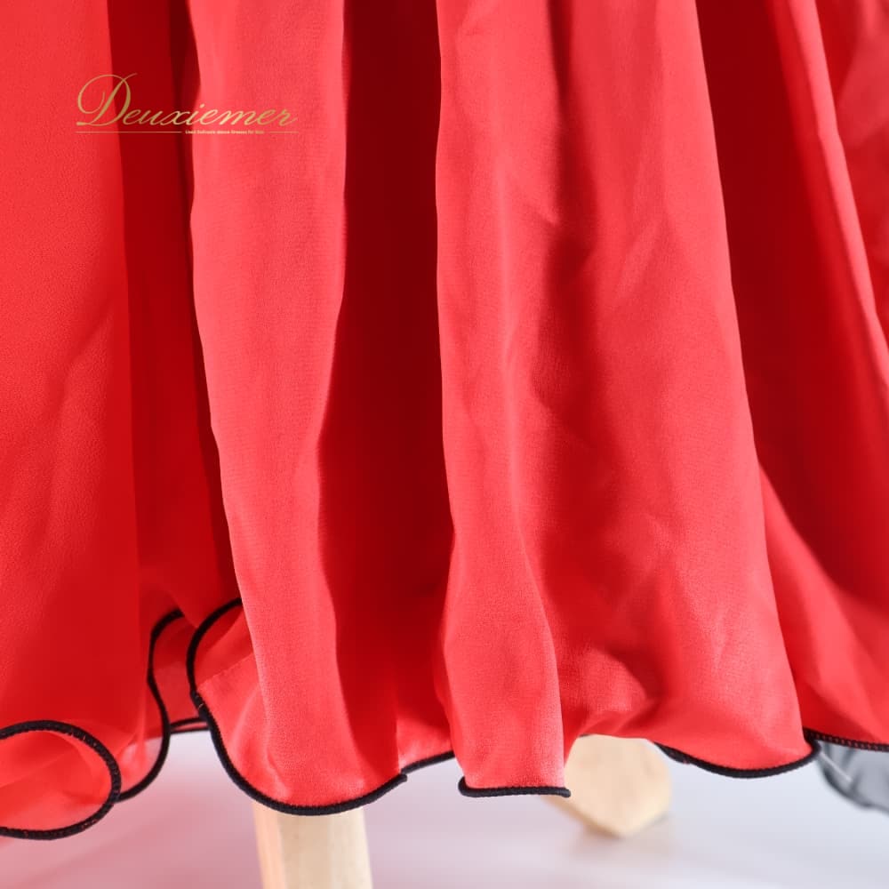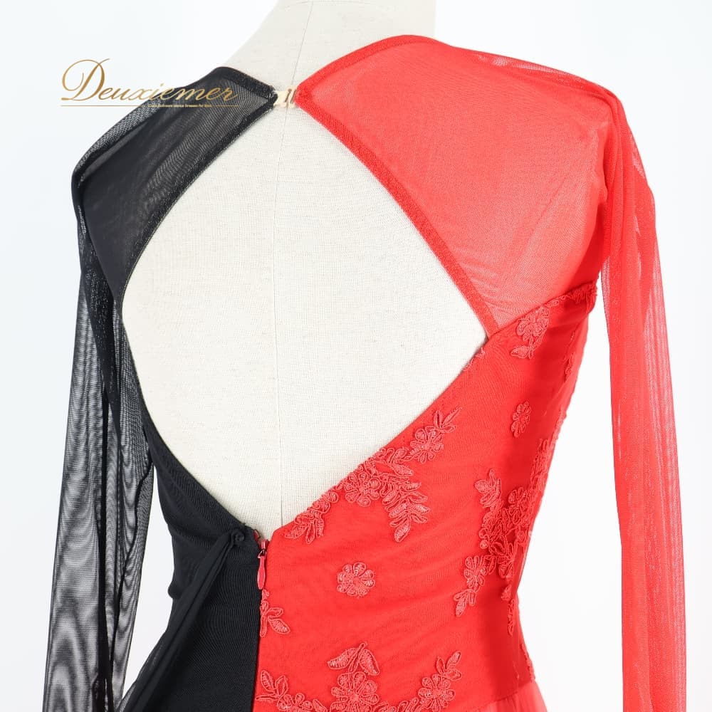 #inTheMOOD #インザムード #日本製 #ブラックコーデ #レッドアクセント #バイカラーデザイン #ゴージャス #華やか #ダンス衣装 #社交ダンス #ステージ衣装 #発表会 #スカートコーデ #フレアスカート #ふんわりシルエット #背面ファスナー #胸パッド付き #Mサイズ #ポリエステル100 #ENUTSU