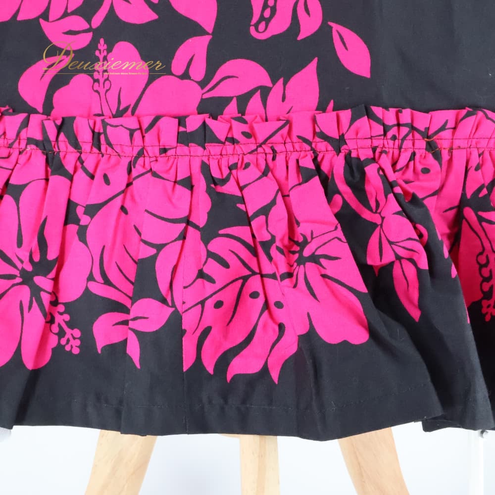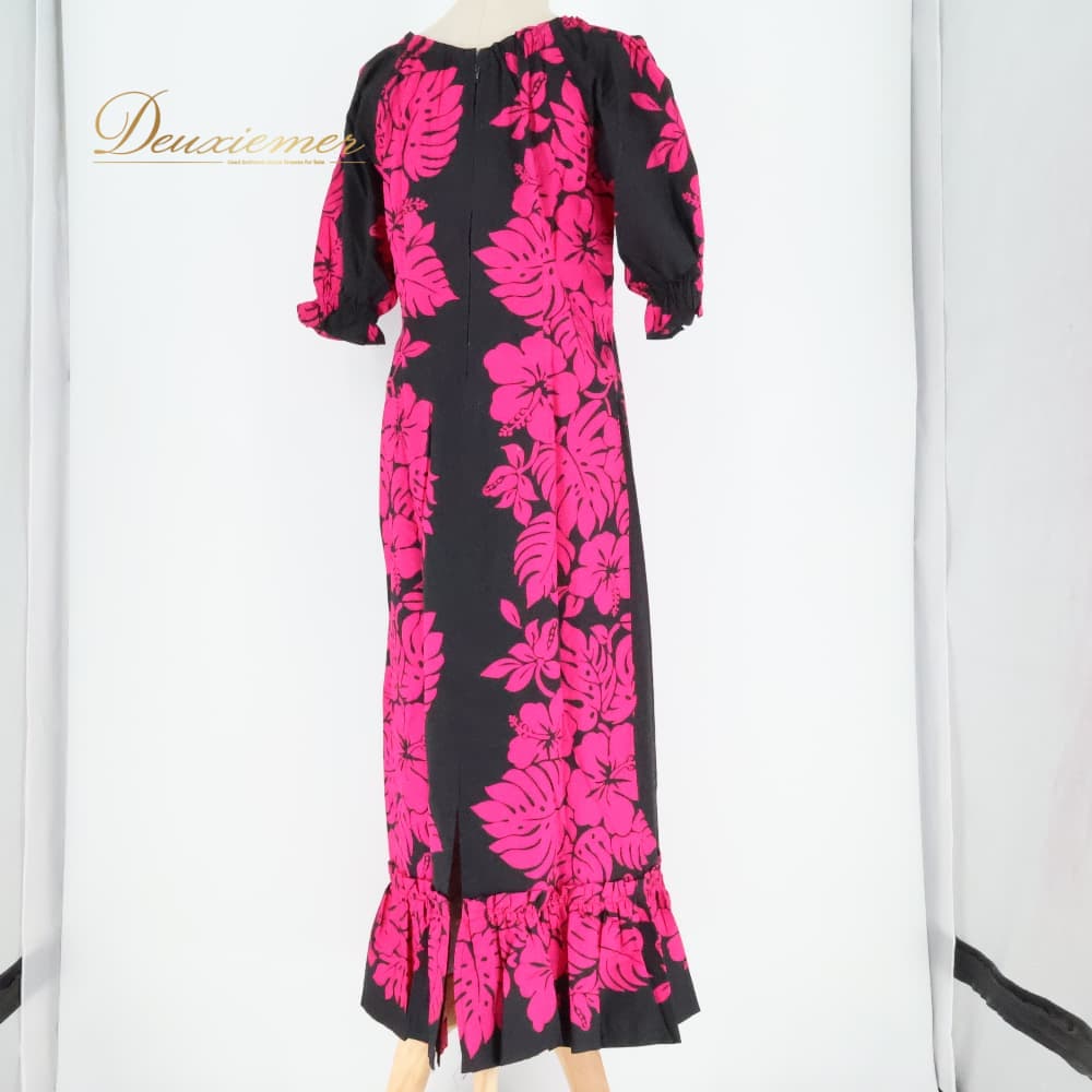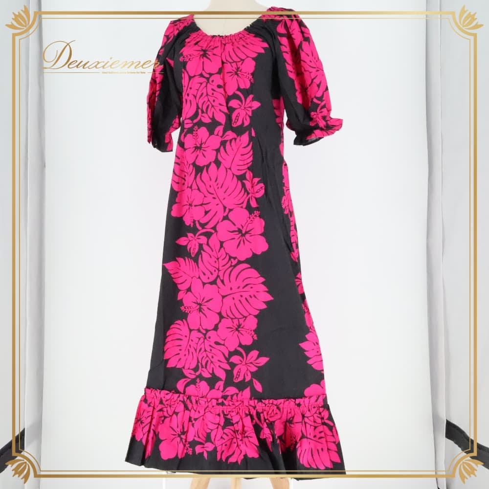 フラダンス 衣装 ワンピース ドレス ブラック系 ピンク系 ツーカラー スリット パフスリーブ ハイビスカス柄 モンステラ柄 かわいい 華やか 鮮やか 黒 ダンス衣装 ハワイアンダンス レディース ハワイアン アロハ ハワイアンプリント ダンス レッスン 練習
