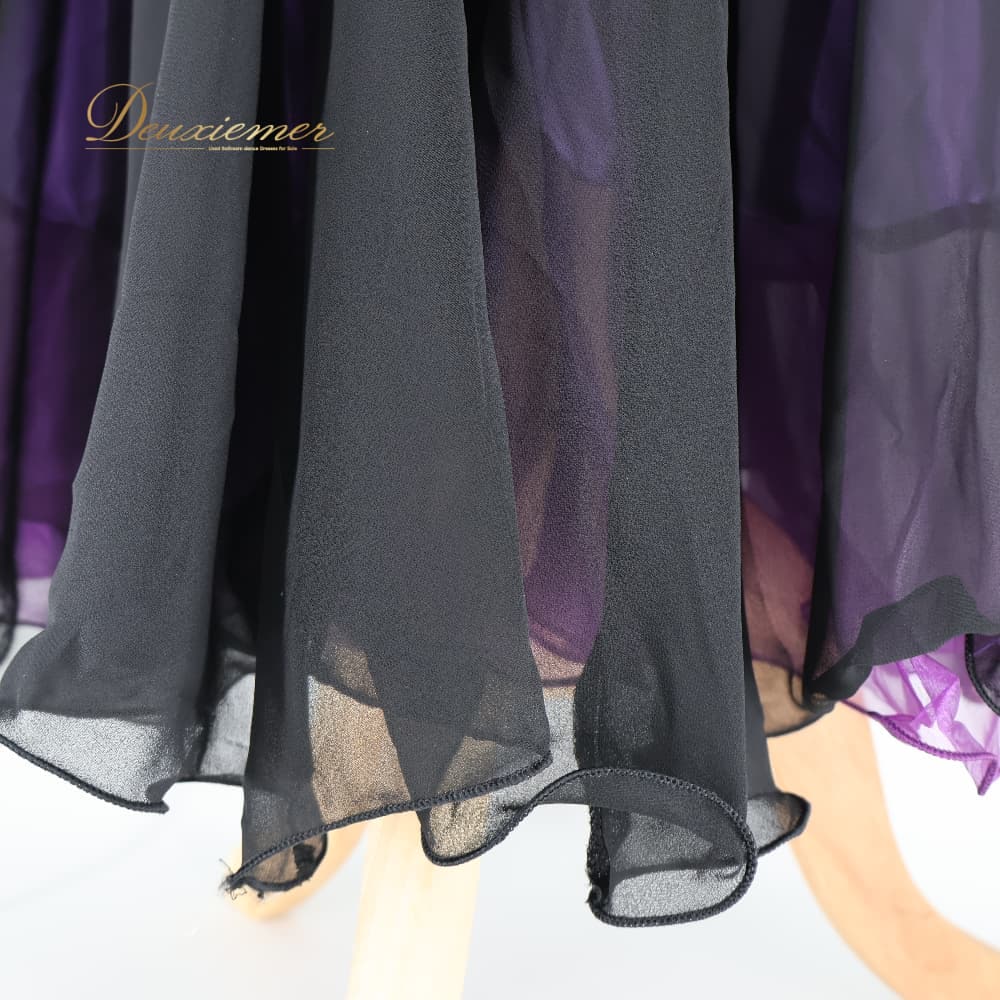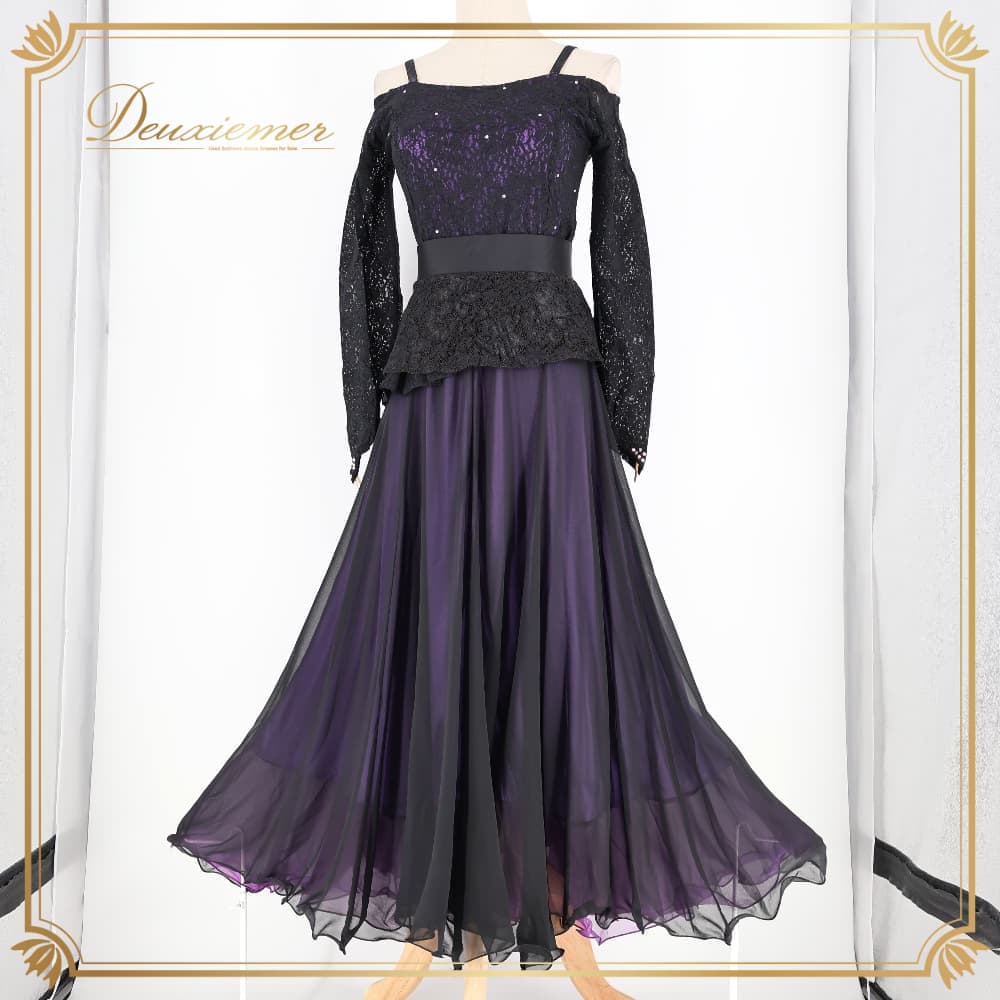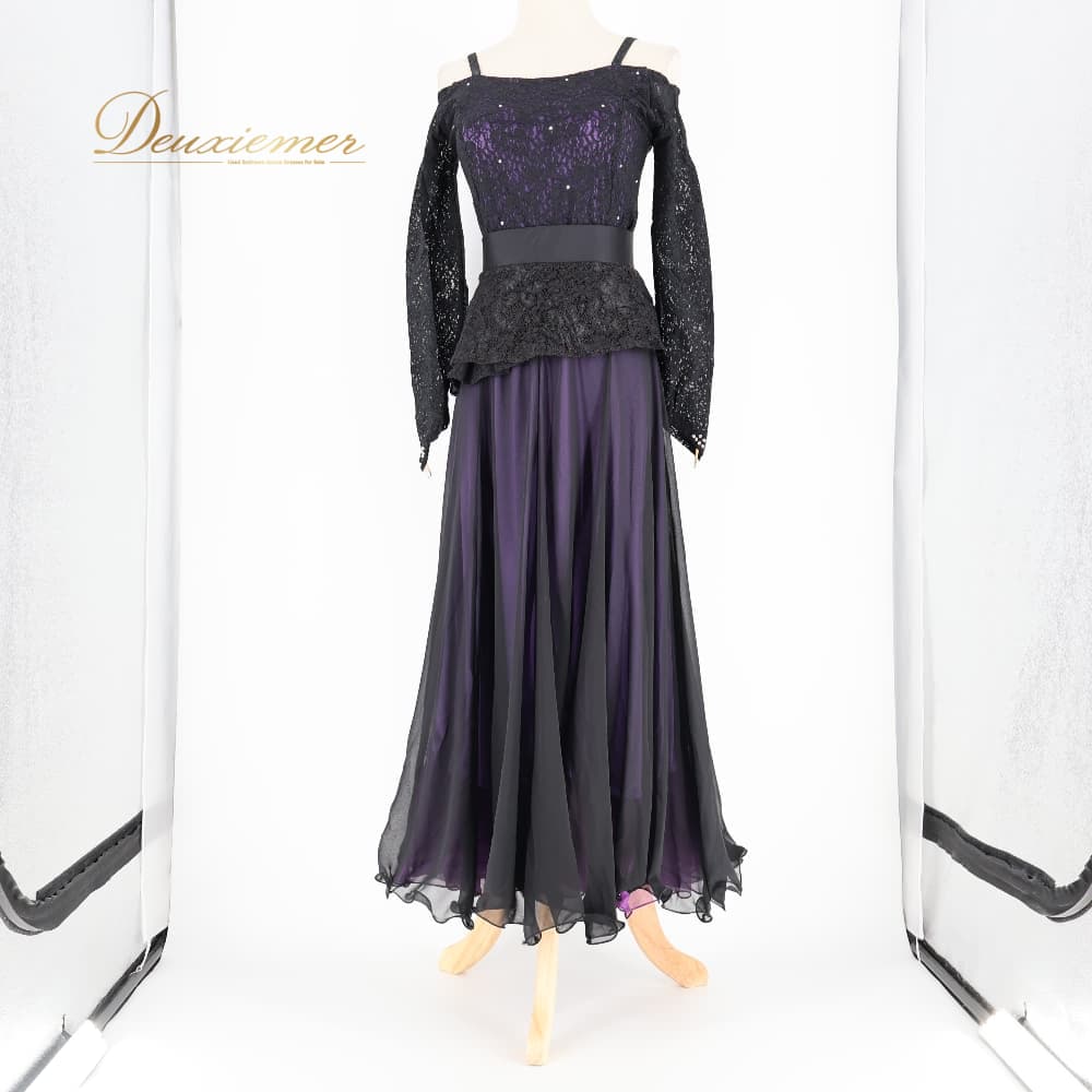 社交ダンス 衣装 ワンピース ドレス ブラック系 レイリーナ Leirena 花 花柄 レース スタンダード リボン 華やか 黒 紫 上品 かわいい 華やか ダンス衣装 イベント ステージ おしゃれ パーティー ダンスパーティー パープル系