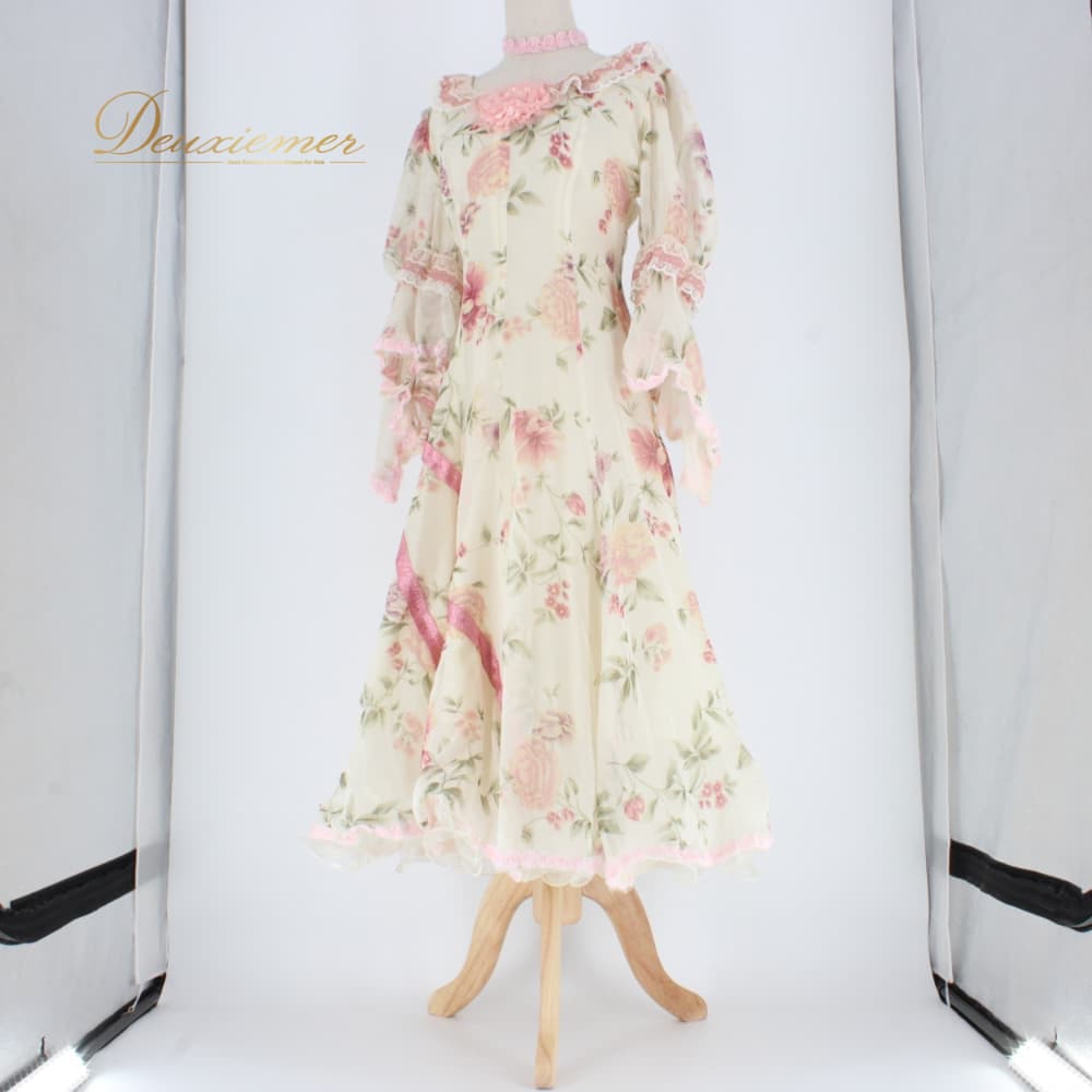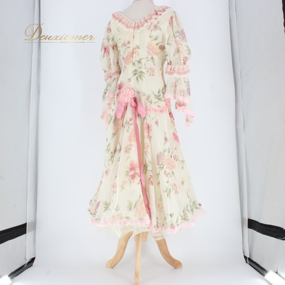 社交ダンス 衣装 スタンダード ドレス ワンピース レッスンウェア パーティドレス Dance Fashion Pier アイボリー ホワイト系 ピンク系 グリーン系 花柄 レース ワンピースドレス 花柄ワンピース レース付き フリル袖 長袖 袖フリル フェミニン ガーリー アイボリー系 ロング丈 体型カバー ドレスワンピース ポリエステル 生地 軽やか きれいめ 大人可愛い 上品 ダンス衣装 フラワーデザイン プリントレース 競技用 お出かけ フォーマル Lサイズ