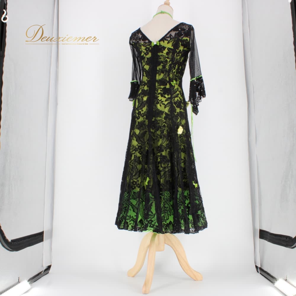社交ダンス 衣装 スタンダード ドレス ワンピース パーティドレス Dance Fashion Pier 黄緑 黒 ブラック系 グリーン系 レース コサージュ スタンダードドレス レディース 黄緑系 花柄 レース生地 総柄 アクセント 透け感 シースルー 袖あり ロング 七分袖 長袖 きれいめ フォーマル ダンス衣装 舞台衣装 発表会 練習用 Mサイズ 日本製 ブランド バックファスナー ポリエステル 裏地あり風 光沢なし フィット&フレア フレアスカート 立体感 体型カバー 111cm総丈