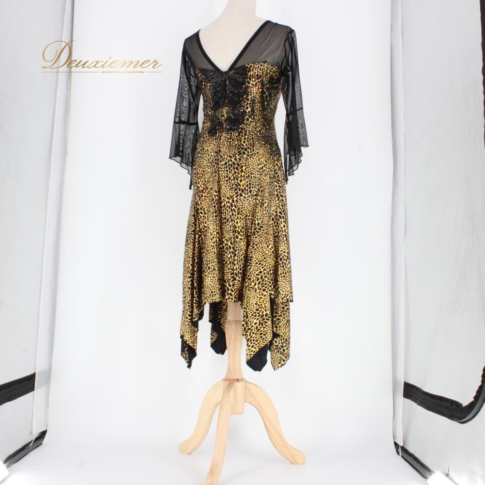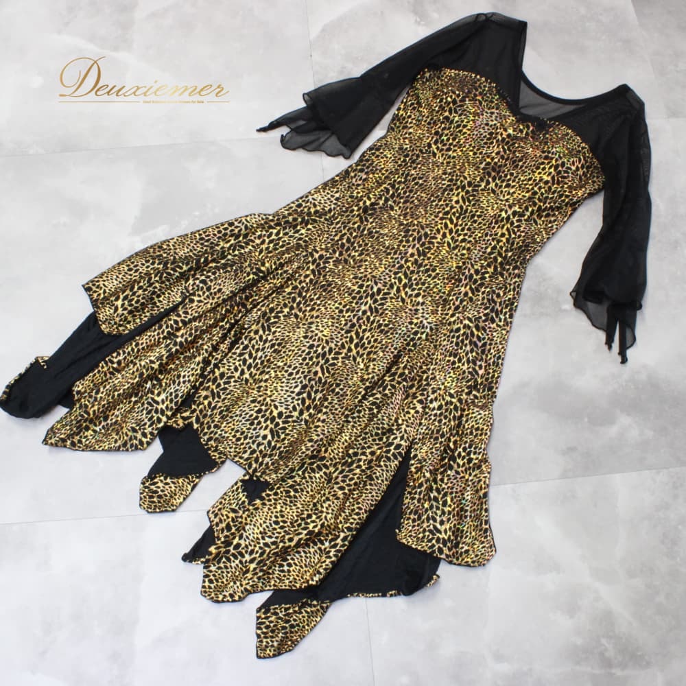 社交ダンス 衣装 ラテン ドレス ワンピース レッスンウェア パーティドレス create-sun ブラック系 ゴールド系 金 黒 レース ラテン柄 ヒョウ柄 アニマル柄 ストレッチ 伸縮性 フレアワンピース 七分袖 フレア袖 透け袖 シースルー ゆったり 着痩せ 体型カバー バックファスナー ロング丈 ミドル丈 胸パッド付き ポリエステル パーティ 競技 レッスン 練習 発表会 ダンス衣装 モダン ダンスワンピース ステージ映え ゴージャス ゴールドラメ風 光沢感 シースルーレース かぶり ひらひら