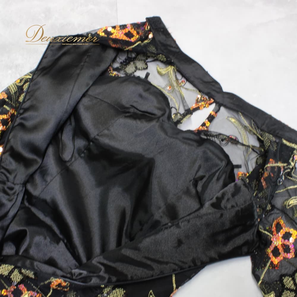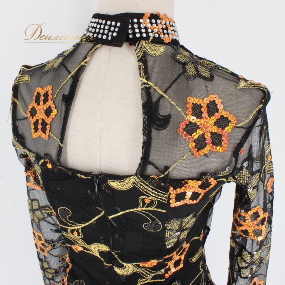 社交ダンス 衣装 ラテン ドレス ワンピース パーティドレス 黒 ブラック系 イエロー系 オレンジ系 レース スパンコール 長袖 ステージ衣装 ラインストーン 柄入り ブラック オレンジ イエロー 花柄 クロス模様幾何学模様 フレアスカート アシンメトリー 透け感 刺繍風 ドレスワンピース ミニ丈 コンパクト丈 ステージ用 舞台用 発表会用 社交ダンス衣装 ラテン衣装 ワンピースドレス ブラックドレス 黒ドレス オシャレ きれいめ カラフル ラメ感 スパンコール系 キラキラ カラー衣装 レース生地