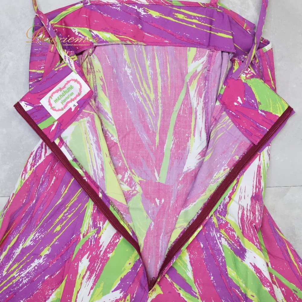 フラダンス 衣装 ワンピース ドレス メネフネプランテーション パープル系 MENEHUNE PLANTETION 日本製 キャミソールドレス カラフル かわいい 華やか 鮮やか 明るい 紫 黄緑 黄 ダンス衣装 ハワイアンダンス レディース レッスン 練習