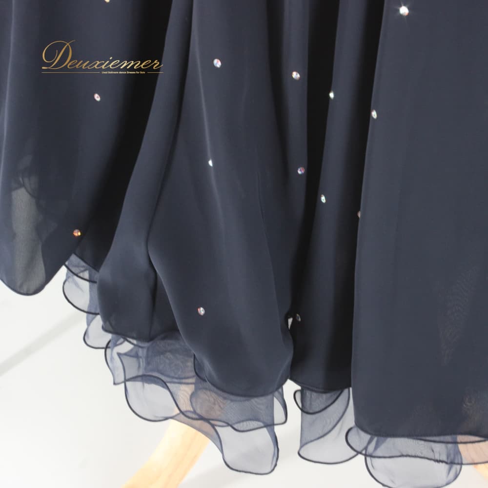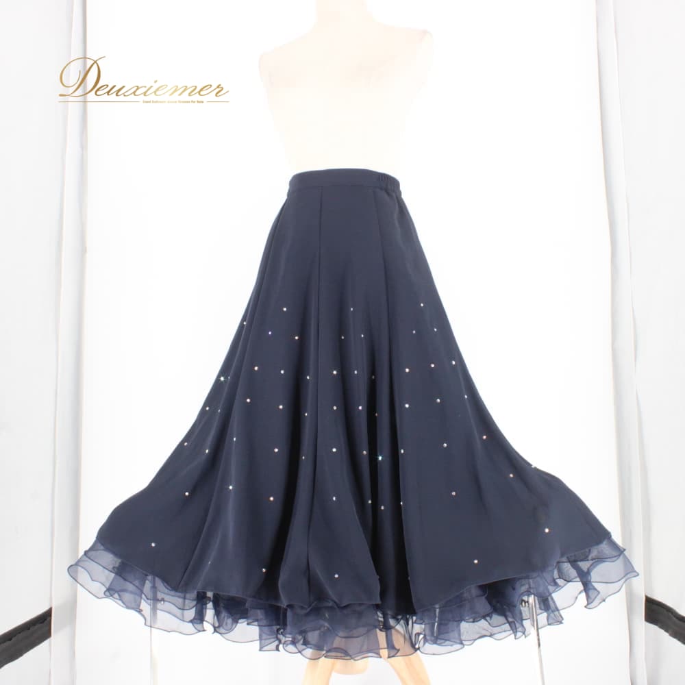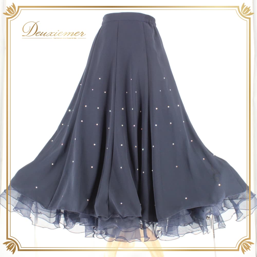 社交ダンス 衣装 スタンダード スカート レッスンウェア レディース 紺 ネイビー系 ラインストーン フォーマル 練習着 シンプル 上品 気品 ネイビー 社交ダンス用スカート ダンス衣装 スタンダードダンス タンゴ ワルツ レッスン用 フォーマルウェア ラインストーン飾り ラインストーン付き キラキラ きれいめ 大人可愛い エレガント シンプルデザイン フレアスカート ふんわりスカート 裾フリル 透け感 透けチュール フォーマルダンスウェア ファスナー仕様 ウエストファスナー 微伸縮 手洗い オシャレ