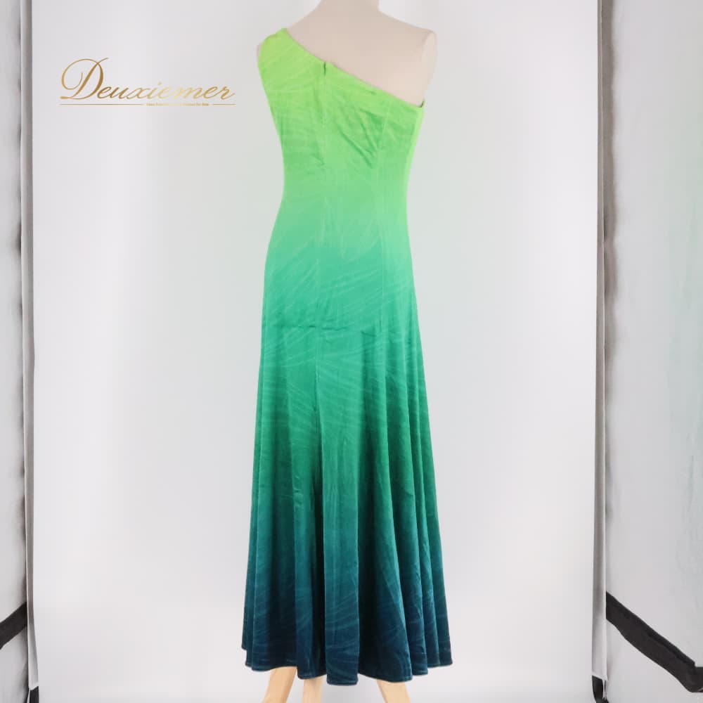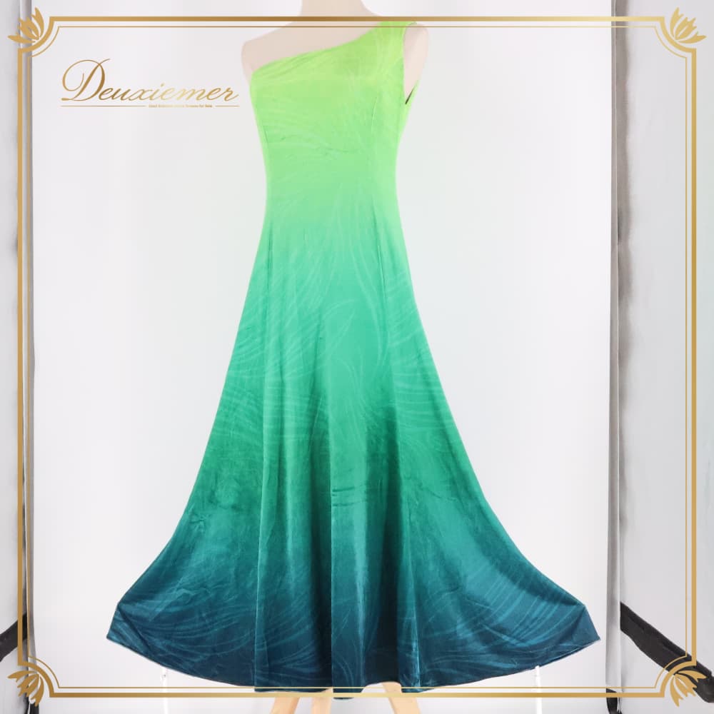 ハワイアンダンス 衣装 BLUE HEAVEN COMPANY ブルーヘヴンカンパニー ワンピース フラダンス グリーン系 ベロア グラデーション アシンメトリー ワンショルダー 華やか 鮮やか 明るい かわいい 緑 ハワイアン アロハ ダンス レッスン 練習