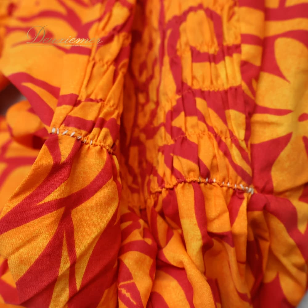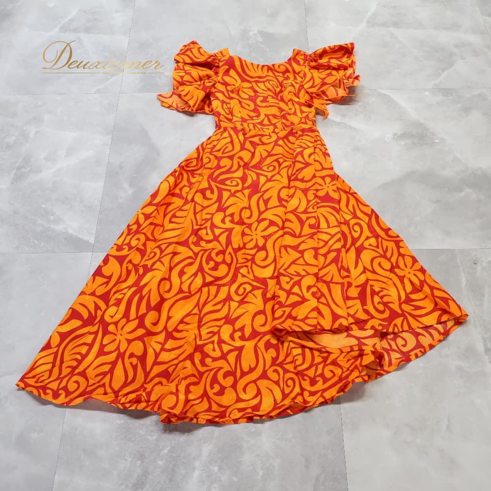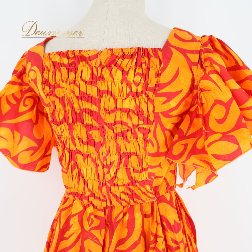 ハワイアンダンス 衣装 MermaidLine MMJ マーメイドライン エムエムジェイ ワンピース フラダンス オレンジ系 ドレス アシンメトリー 赤 ティアレ柄 花柄 華やか かわいい ダンス衣装 イベント ステージ ハワイアンプリント アロハ レッド系
