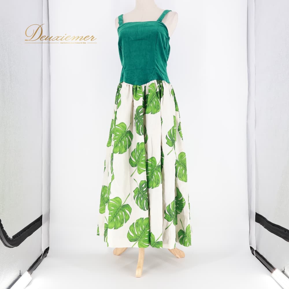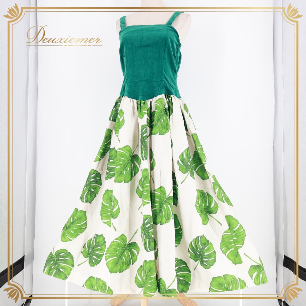 ハワイアンダンス 衣装 ワンピース フラダンス グリーン系 フラ ダンス モンステラ柄 緑 白 ドレス 華やか ダンス衣装 イベント ステージ 袖なし ハワイアン アロハ ハワイアンプリント かわいい