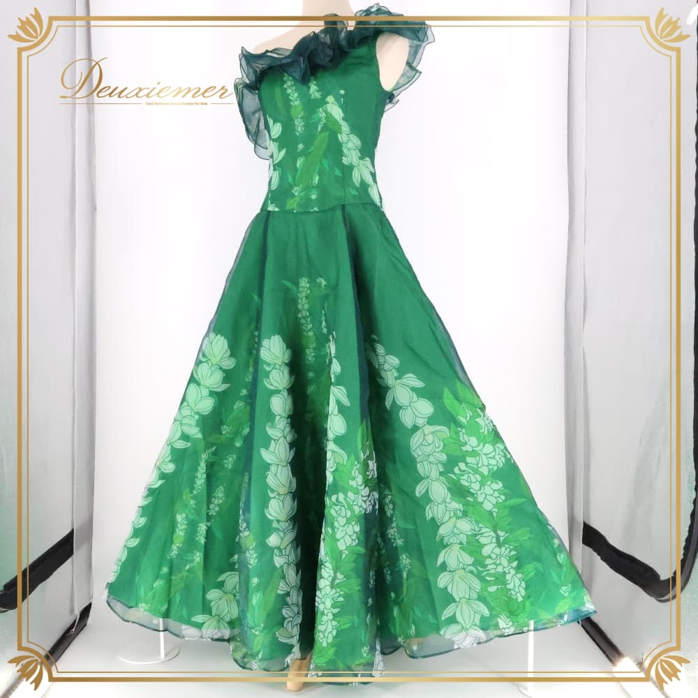 ハワイアンダンス 衣装 CoCoEmily ココエミリー ワンピース フラダンス グリーン系 ワンショルダー アシンメトリー チュール生地 フリル ワントーン かわいい 華やか 鮮やか 明るい きれい 上品 ハワイアン アロハ フラ ダンス レッスン 練習