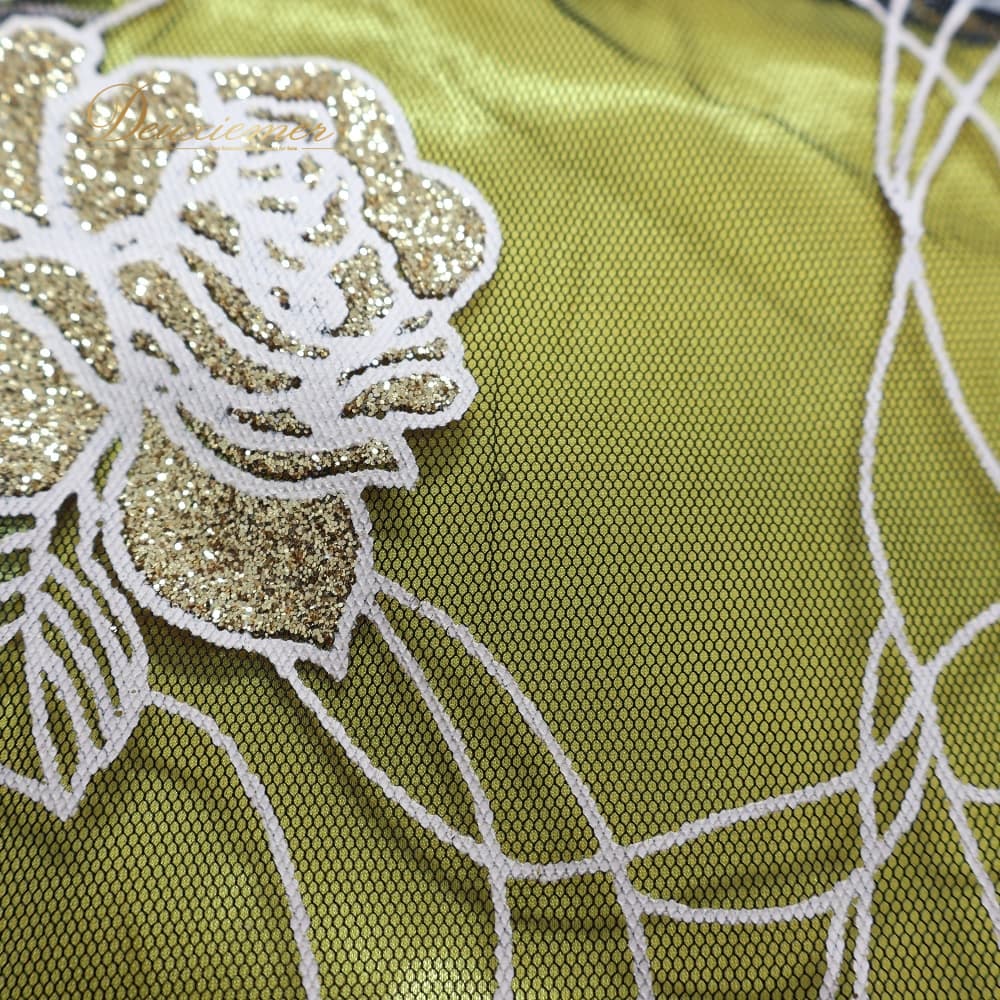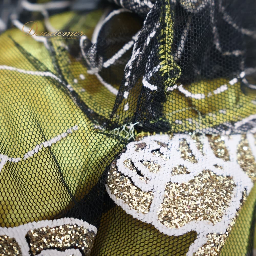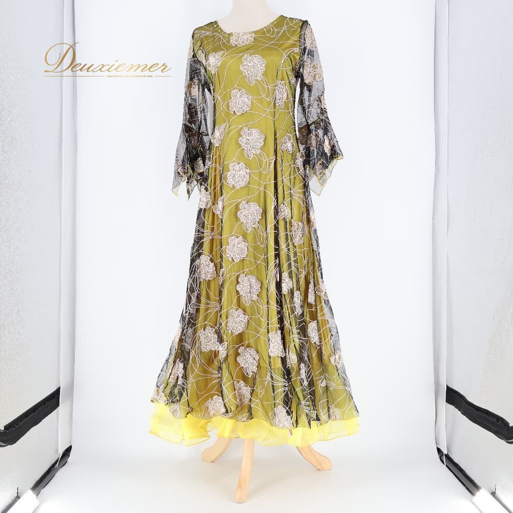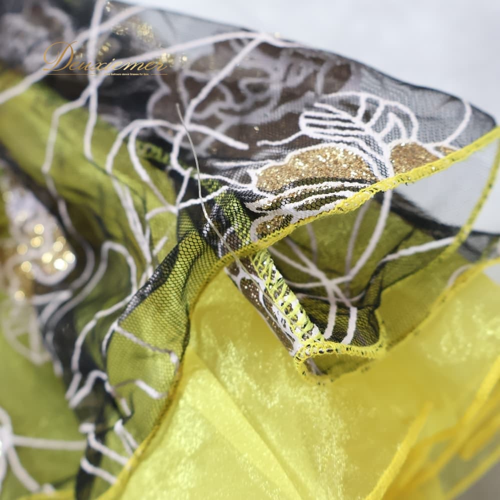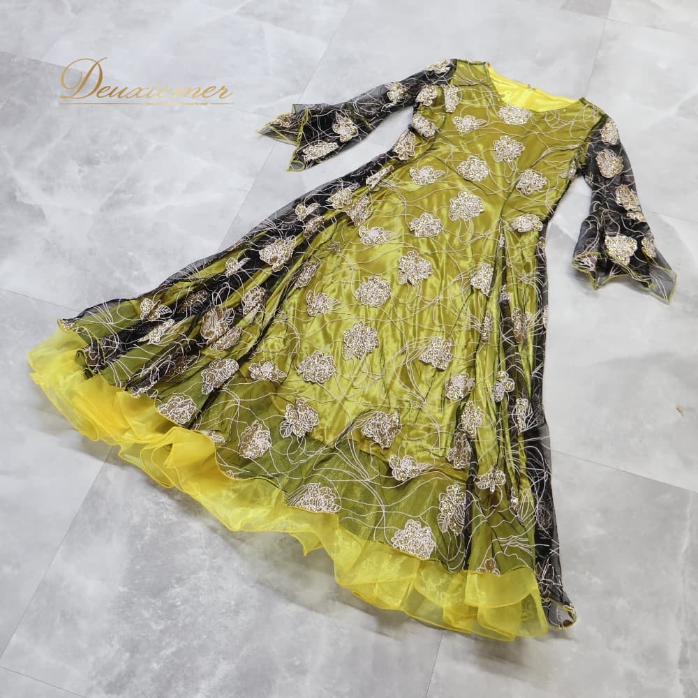 社交ダンス 衣装 ワンピース スタンダード イエロー系 ドレス 花 花柄 ラメ 透け感 黄 黒 キラキラ 華やか ボリューム ダンス衣装 イベント ステージ パーティー ダンスパーティー かわいい 上品 ブラック系