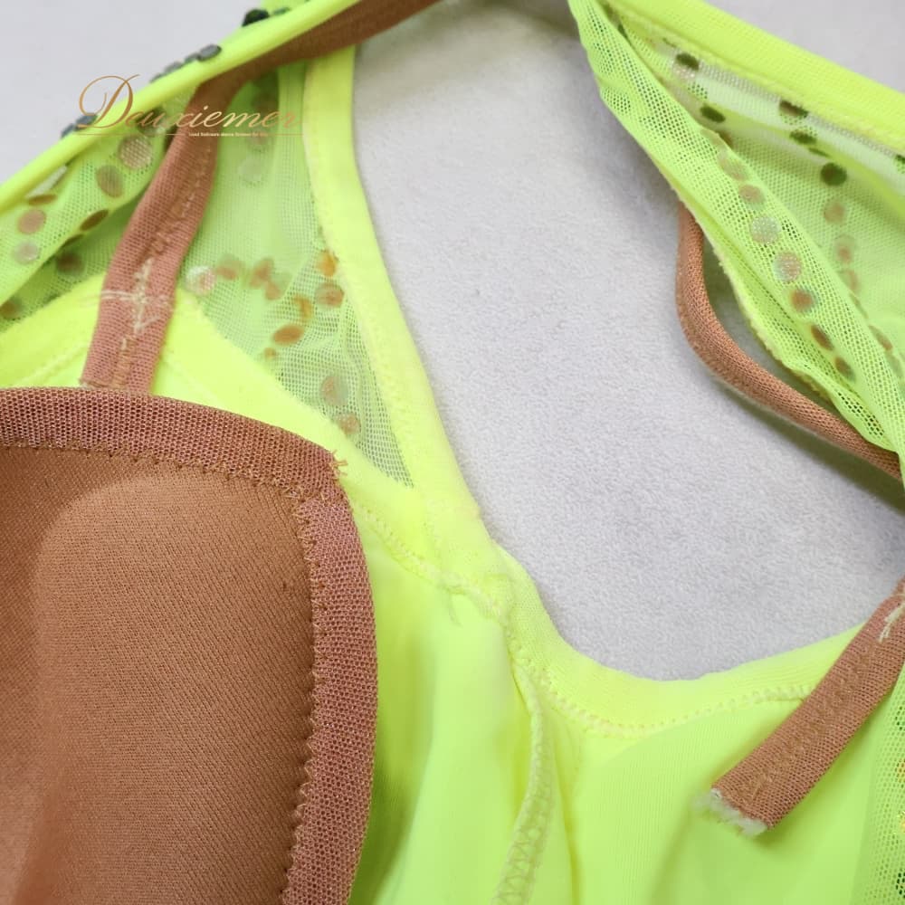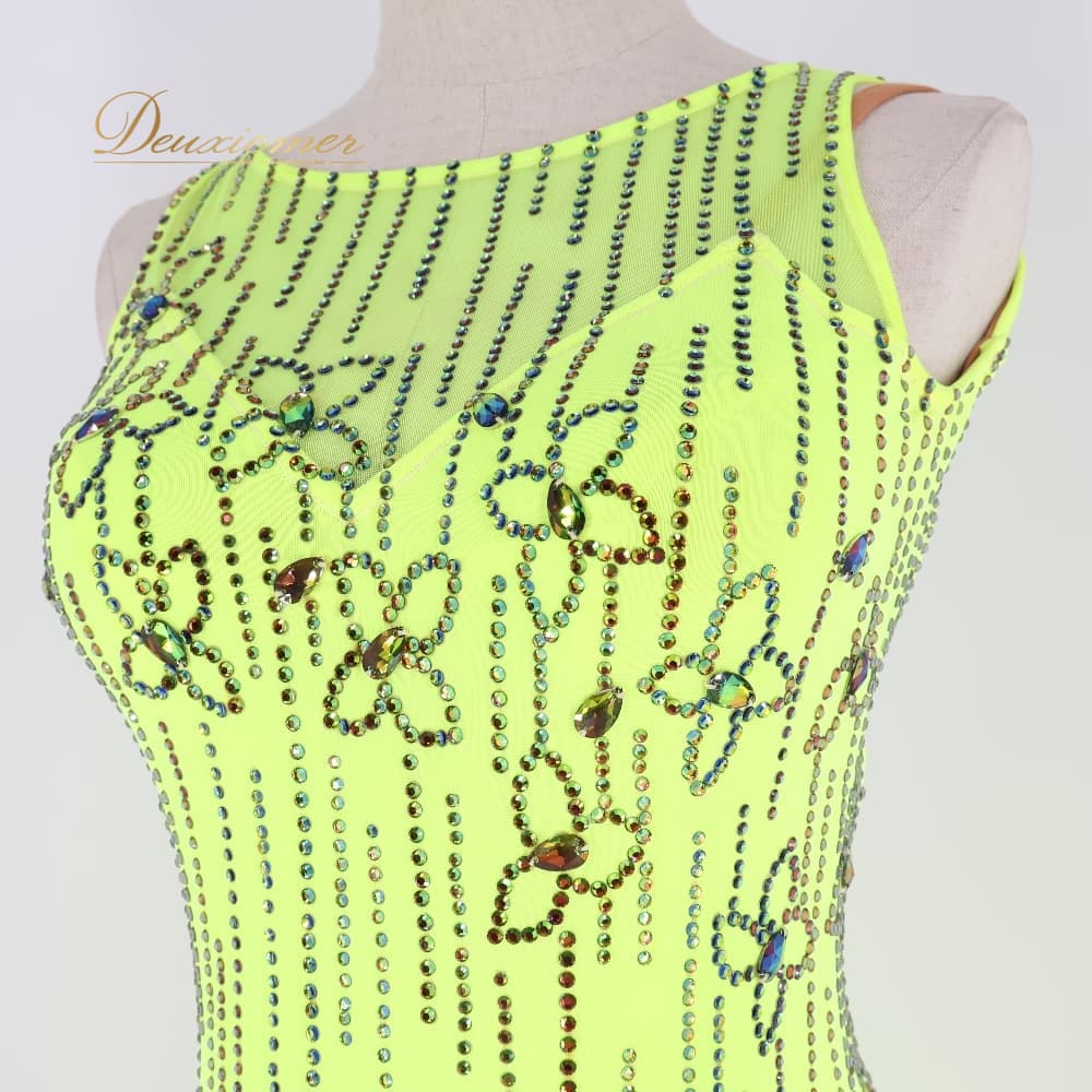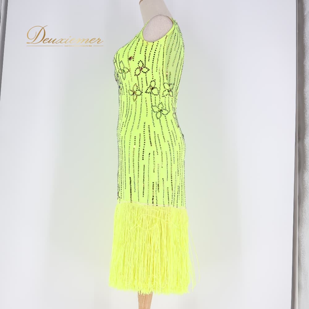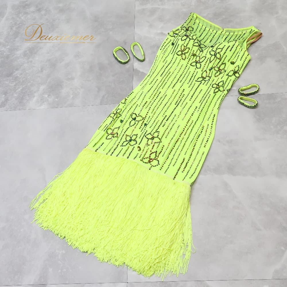 社交ダンス 衣装 CHRISANNE クリスアン ドレス ラテン グリーン系 イエロー系 蛍光 黄色 黄緑 フリンジ デモ 競技 ダンス パーティ 発表会 鮮やか ビジュー 華やか 発表会用 デモ用 競技用 デモンストレーション イベント ダンスパーティ