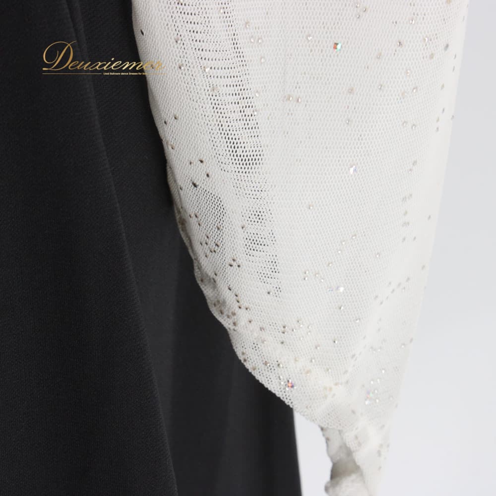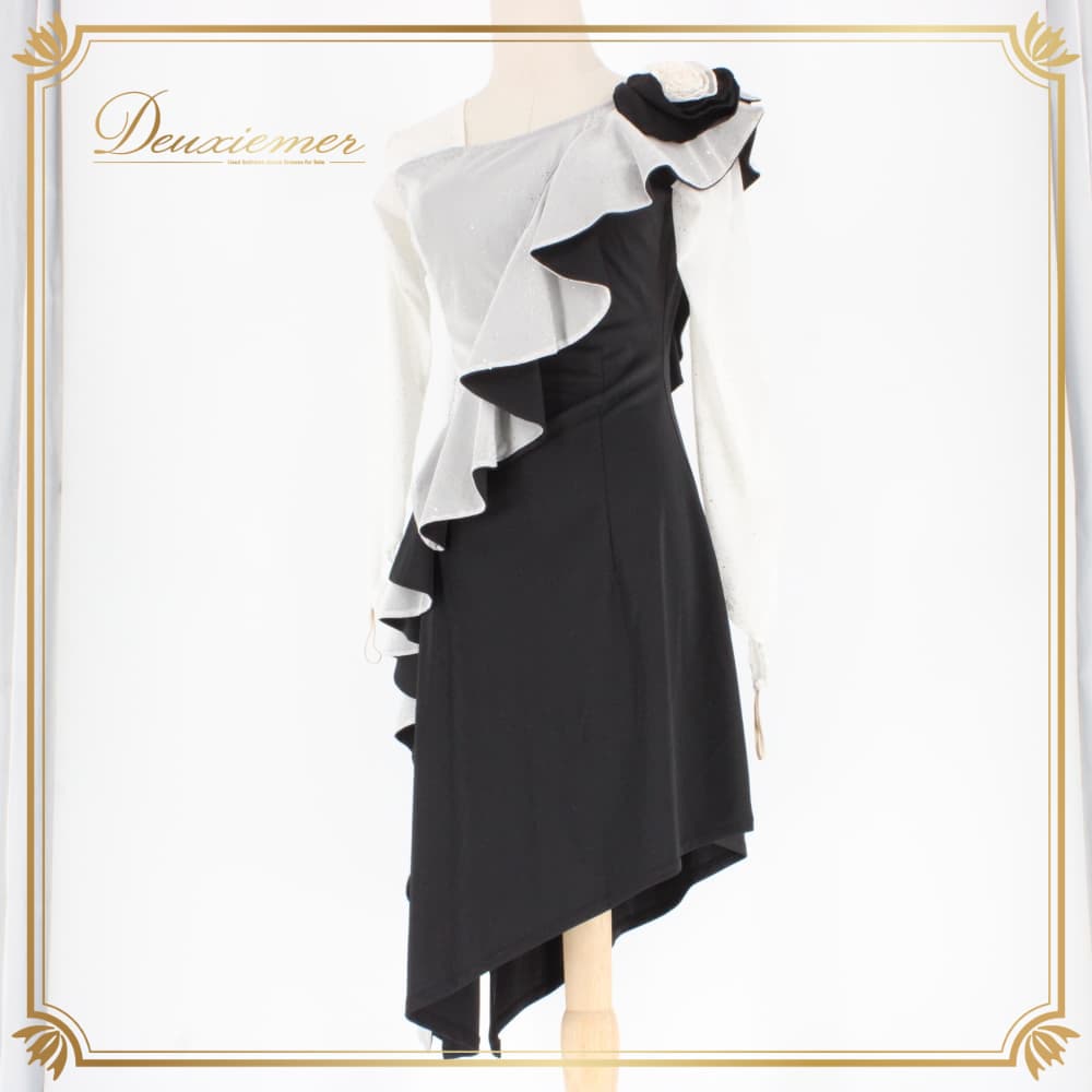 社交ダンス 衣装 ドレス ラテン ブラック系 ホワイト系 白 黒 アシメ アシンメトリー キラキラ レース 長袖 ワンピース 準正装 ラテンワンピース レディース ブラックドレス ホワイトドレス モダン ラテン兼用 社交ダンスドレス アシンメトリードレス アシメデザイン フリル風 デザイン袖 長袖ワンピース ひざ丈 アシメ丈 モノトーン コントラスト 白黒 重ね風 コサージュ 肩コサージュ セミフォーマル フォーマル ワンピースドレス ポリエステル素材 ポイントアクセント 伸縮素材 ラテンドレス イベント