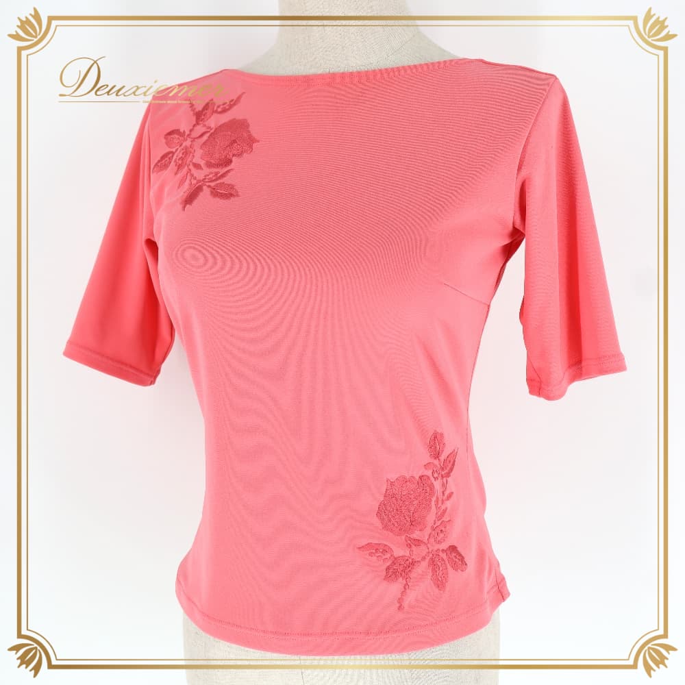 社交ダンス 衣装 Chacott Dance Sport チャコット ダンススポーツ Tシャツ カットソー レッスンウェア ピンク系 バラ柄 刺繍 五分袖 華やか 鮮やか かわいい おしゃれ 上品 花柄 植物柄 M レディース 練習着 ダンス レッスンウエア フラワー 刺しゅう 花モチーフ 五分丈 トップス 半袖風 コーラルピンク系 上品デザイン 可愛い系 華やか系 伸縮生地 ポリエステル100% 国産 日本製 チャコット正規 チャコットダンススポーツ 競技 ダンスウェア ドレスコード対応