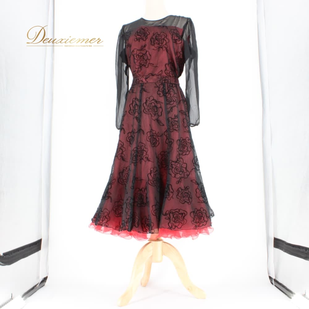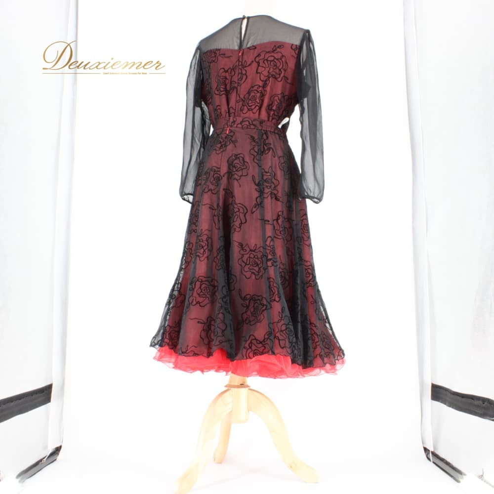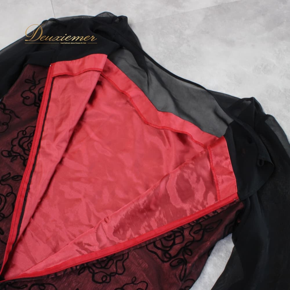 社交ダンス 衣装 U:NA ユーナ ツーピース スタンダード ブラック系 レッド系 レース 赤 黒 上下セット セットアップ 花柄 長袖 レオタード ワンピース風 ローズ柄 フロッキー 花模様 ダンスウェア ボタン チュール風 シースルー ブラウス風 スカート 単色配色 黒×赤 スタンダード用 女性用 大人 上品 きれいめ 華やか 発表会 練習用 試合用 コスチューム ダンスコーデ ラテン ではない スリーブ付き