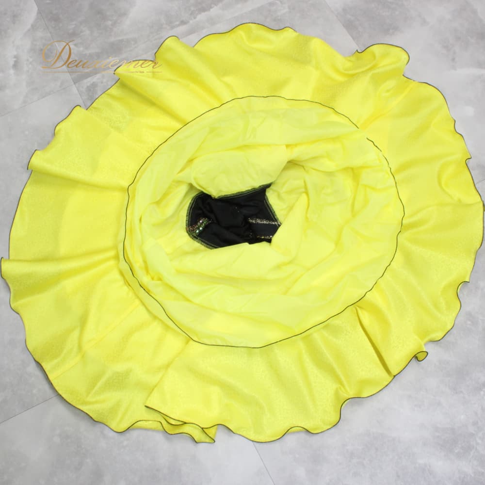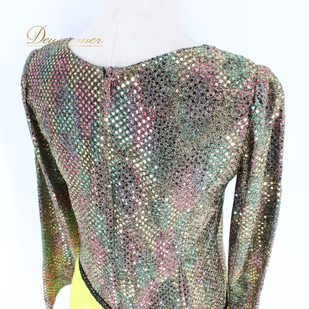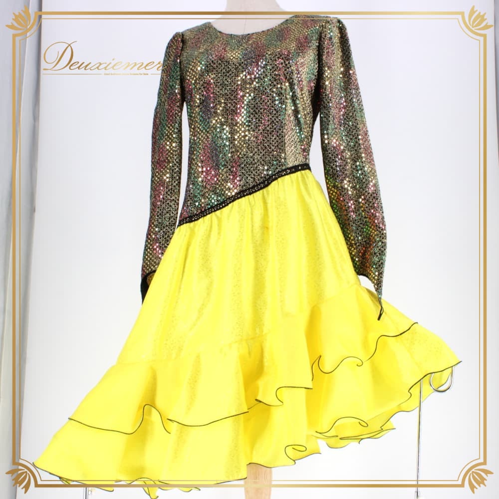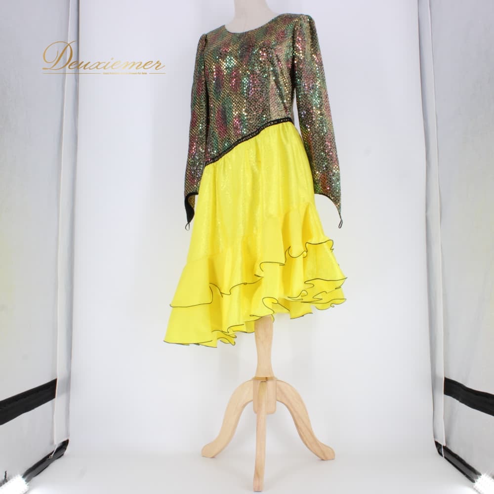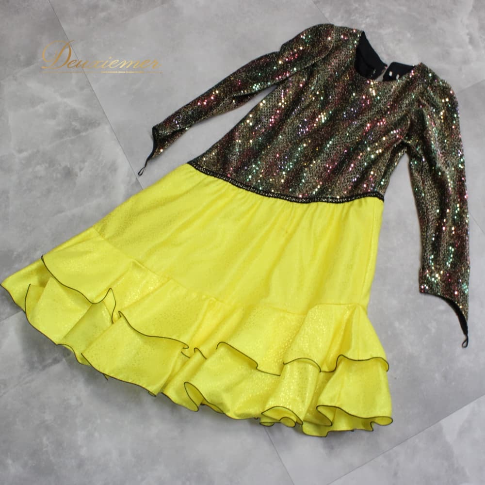 社交ダンス 衣装 FRESA フレサ ドレス ラテン ブラック系 イエロー系 ゴールド系 黄色 黒 金 キラキラ 長袖 アシンメトリー アシメ 準正装 モダン衣装 演舞用 競技用 ワンピース フレアスカート フレア 黒系 光沢 タイト 上半身フィット 切替 ウエストマーク 背面ファスナー ステージ衣装 発表会 ダンス服 フォーマル ブランド