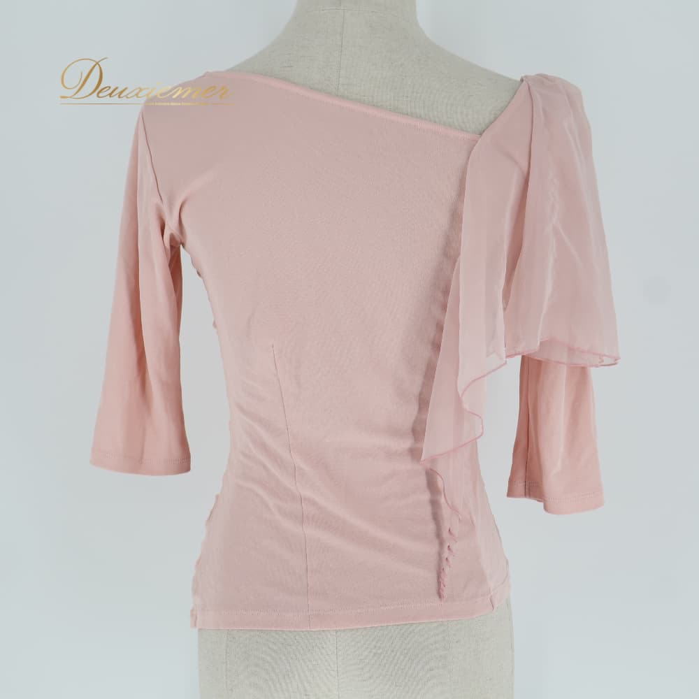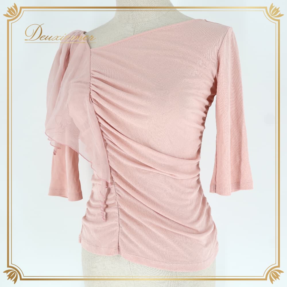 社交ダンス 衣装 Chacott ROYAL DANCE チャコットロイヤルダンス トップス ブラウス レッスンウェア ピンク系 日本製 チュール ギャザー 透け感 薄ピンク かわいい おしゃれ 上品 ダンス 社交ダンス用 ピンク フリル 生地 伸縮 伸縮性あり 切替 デザイン きれいめ 大人可愛い オシャレ 服 レディース 女性用 七分袖 五分袖 袖フリル ルームウェア 競技 舞台 コーデ 衣類