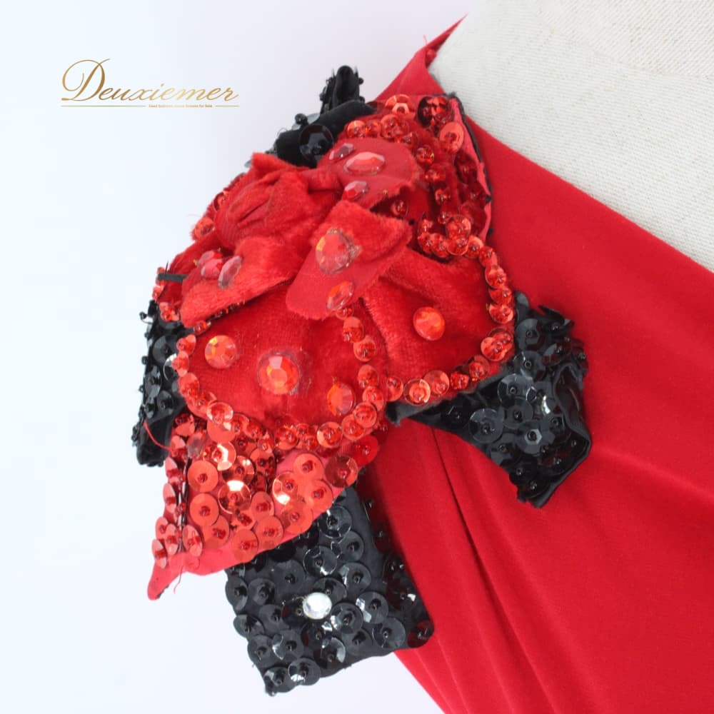 社交ダンス 衣装 ドレス ワンピース ラテン ブラック系 レッド系 赤 黒 バイカラー 派手 ステージ衣装 パーティ衣装 カラオケ ノースリーブ ノースリーブドレス ラテンドレス フレアワンピース マキシワンピース 赤ドレス 黒ドレス バイカラードレス ダンス衣装 コサージュ フラワー アシンメトリー風 裾長め フレアスカート 切替デザイン ツートン フィット感 伸縮素材 女性用 演技 発表会 舞台 競技用 カラオケ衣装 ダンスワンピース フィッシュテール風