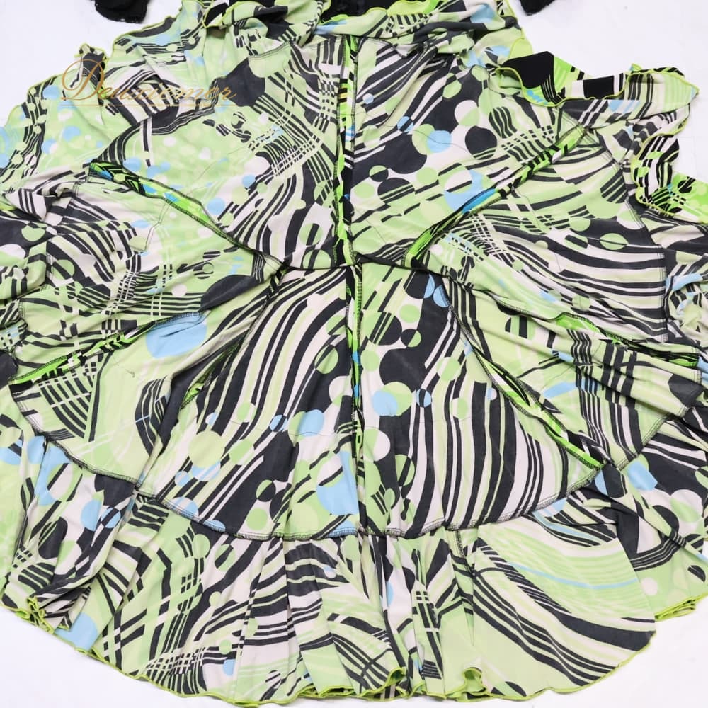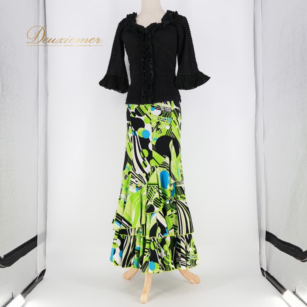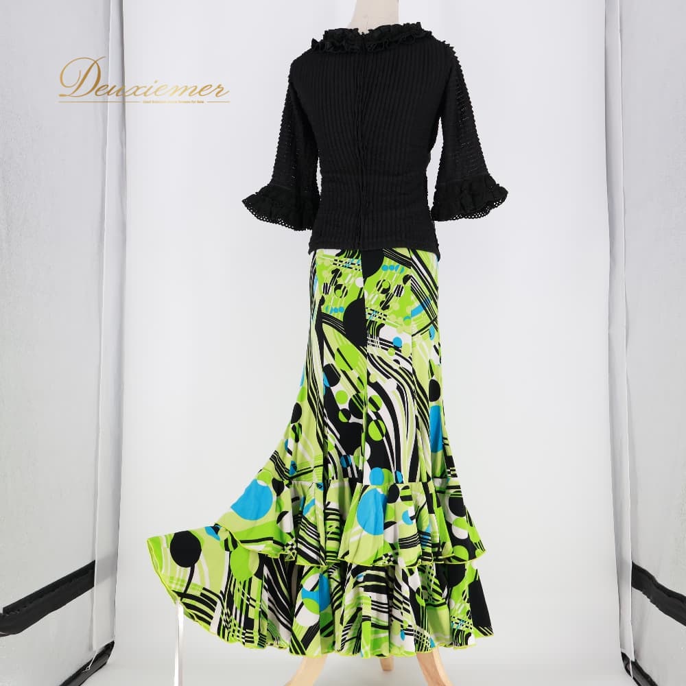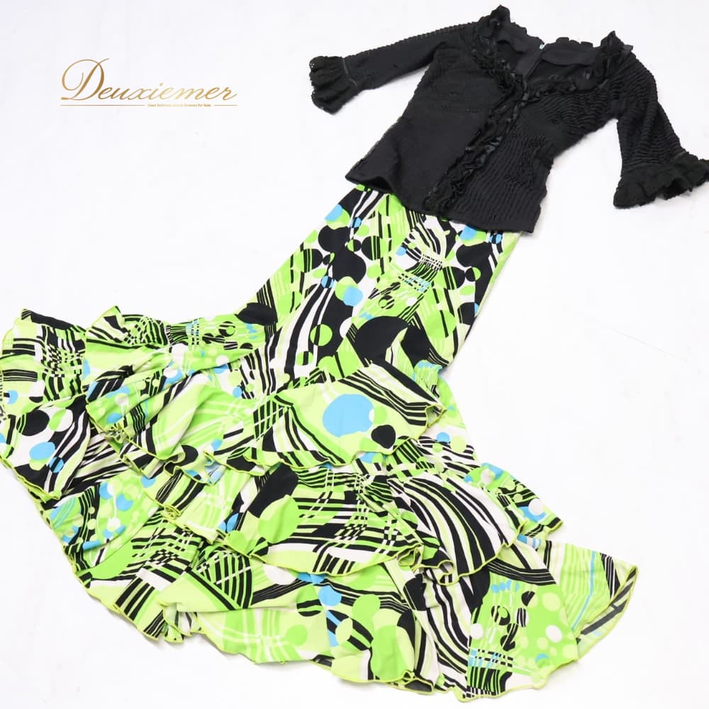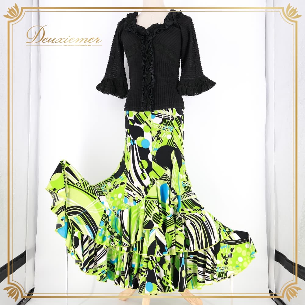 フラメンコ 衣装 SONIA JOHNES ソニアジョーンズ ツーピース ブラック系 トップス ファルダ スカート 上下セット セットアップ 幾何学模様 緑 黒 白 青 可愛い ボランテ フリル 華やか ダンス衣装 イベント ホワイト系 ブルー系 グリーン系
