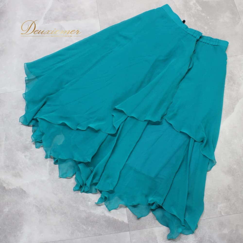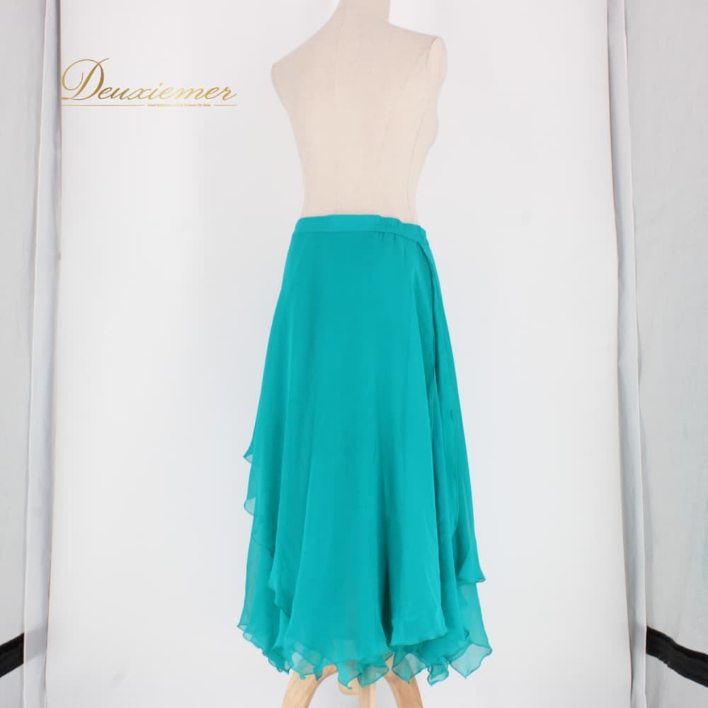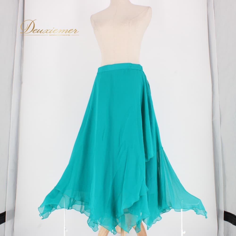 社交ダンス 衣装 Sanline サンリーヌ スカート レッスンウェア ブルー系 グリーン系 青緑 無地 フォーマル シンプル 練習着 上品 ウエストファスナー ロングスカート フレアスカート シフォン風 ひらひら すそ広がり ダンス レッスン 競技 発表会 ドレス パーティー きれいめ エレガント 大人 清楚 ステージ映え 青緑系 ボリューム感 軽やか フォーマル女子 伸縮性 少し伸びる ポリエステル素材 Lサイズ 練習用 ルンバ モダン ラテン サンライン 日本製