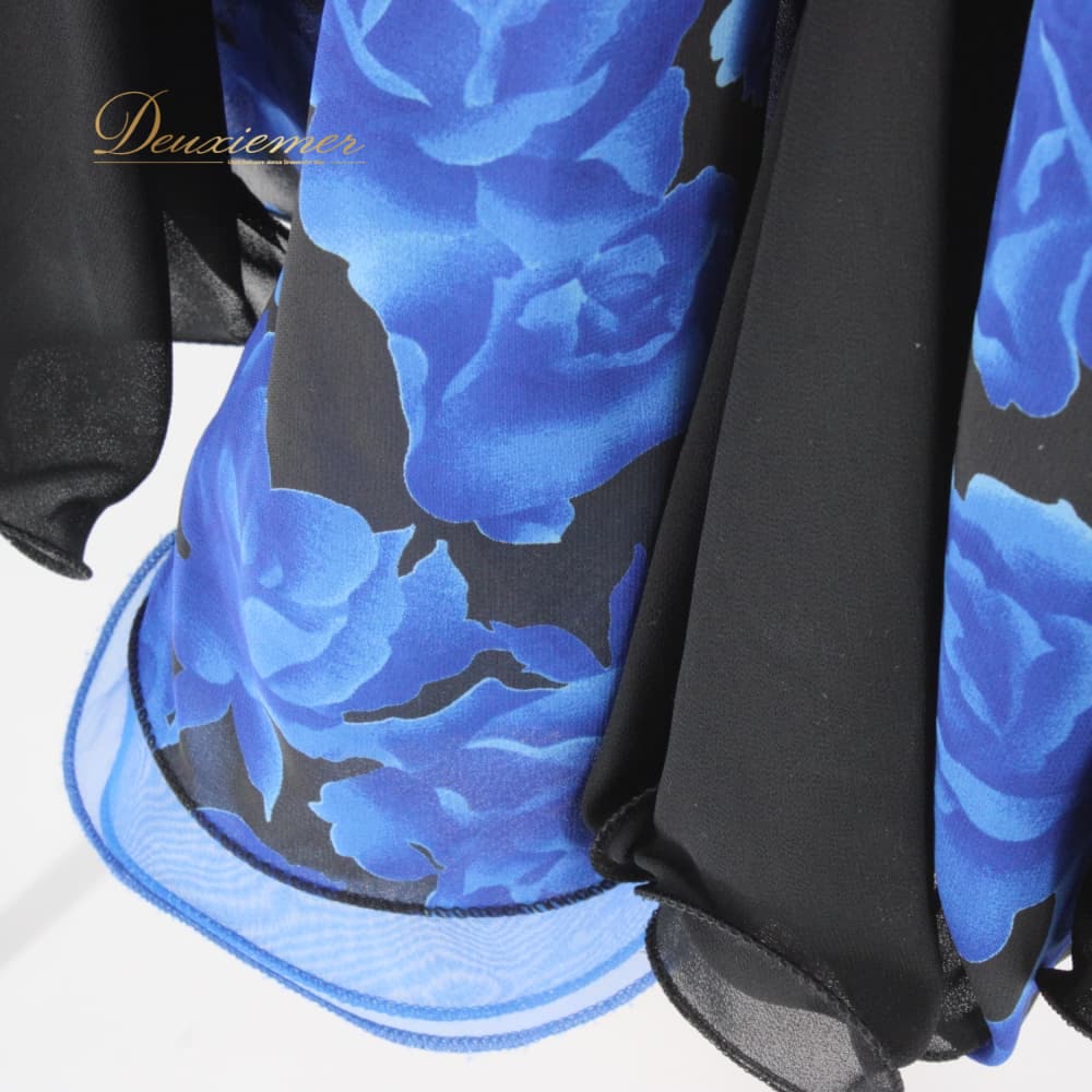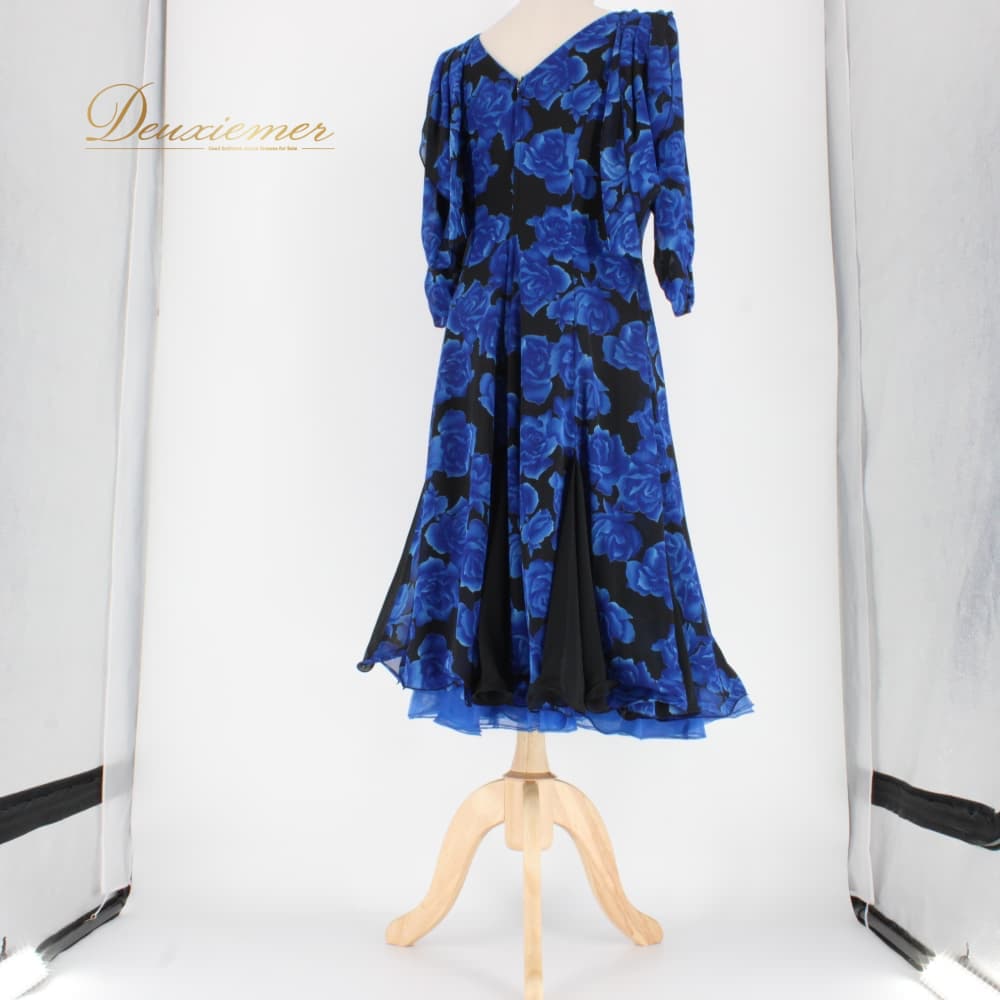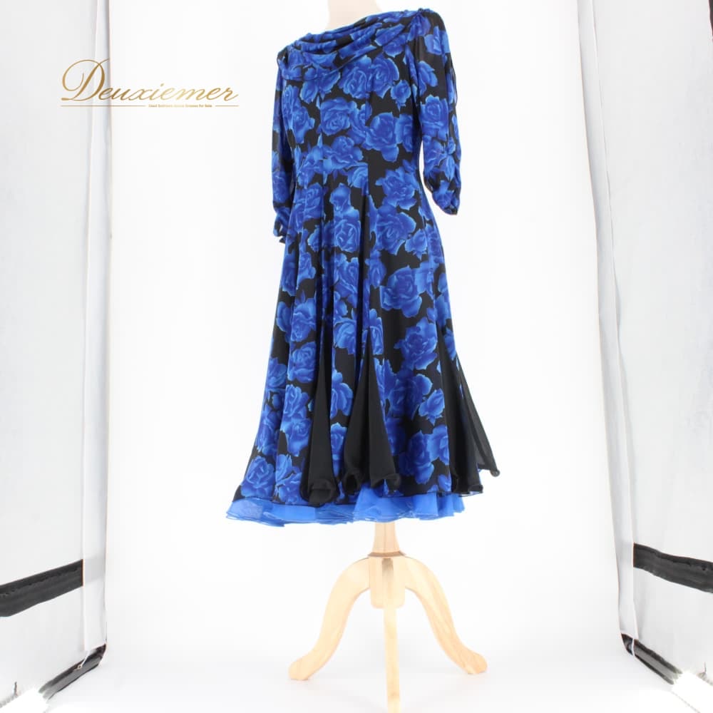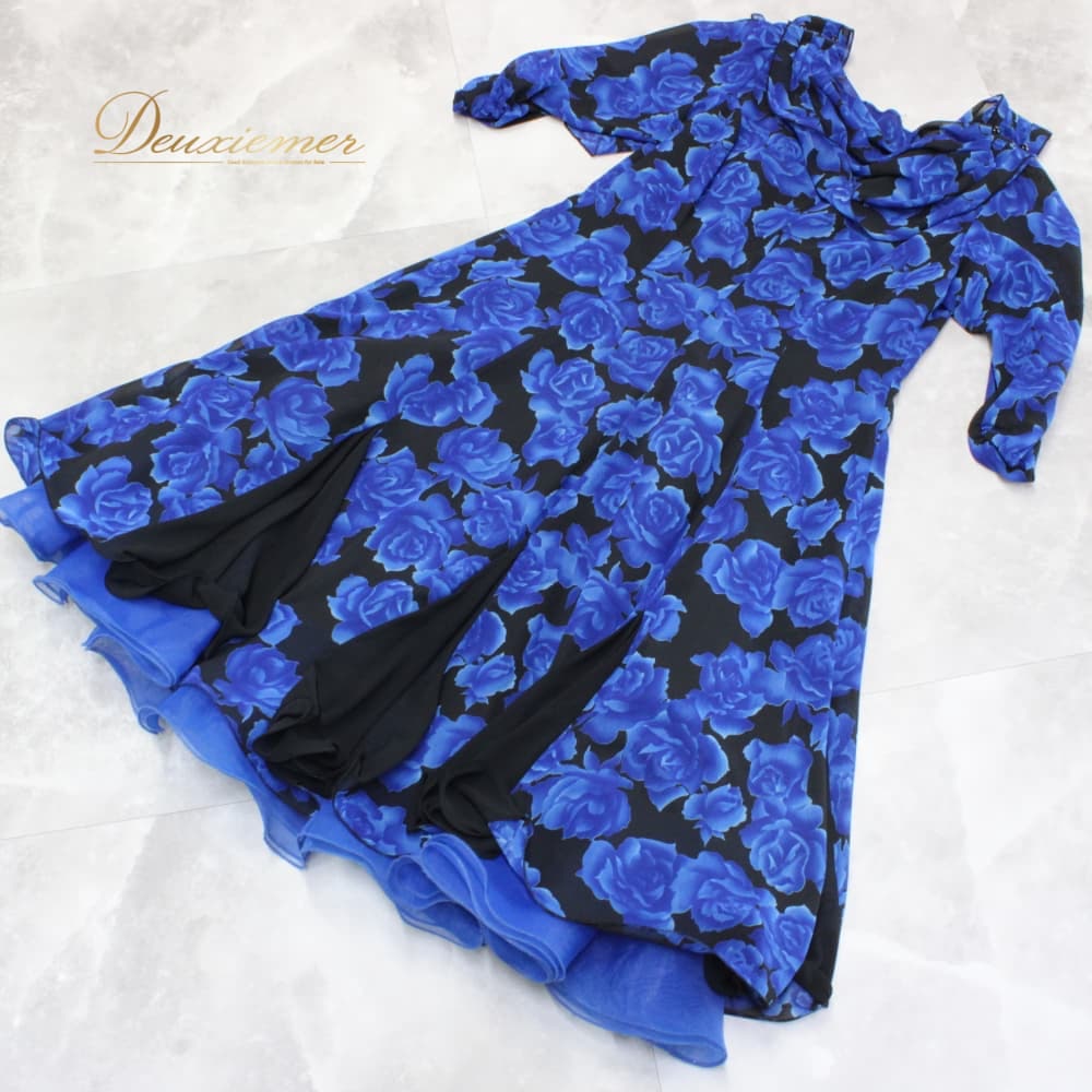 社交ダンス 衣装 Sekine セキネ ドレス スタンダード ブラック系 ブルー系 薔薇 バラ 花柄 ワンピース パーティ衣装 ステージ衣装 長袖 青 黒 社交ダンス衣装 Lサイズ 日本製 スタンダード用 フラワー柄 薔薇柄 バラ柄 花柄プリント ロング丈 袖あり ロングワンピース フレアスカート きれいめ フォーマル ラテンではない スカート裾 シフォン風感 裏地あり パーティードレス 発表会 記念日 イベント ローズプリント 青バラ 花モチーフ バックスファスナー 黒地 結婚式二次会 和装卒業式