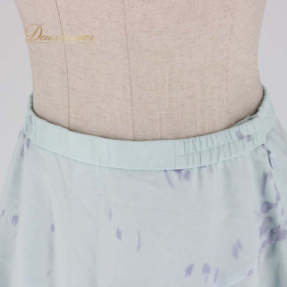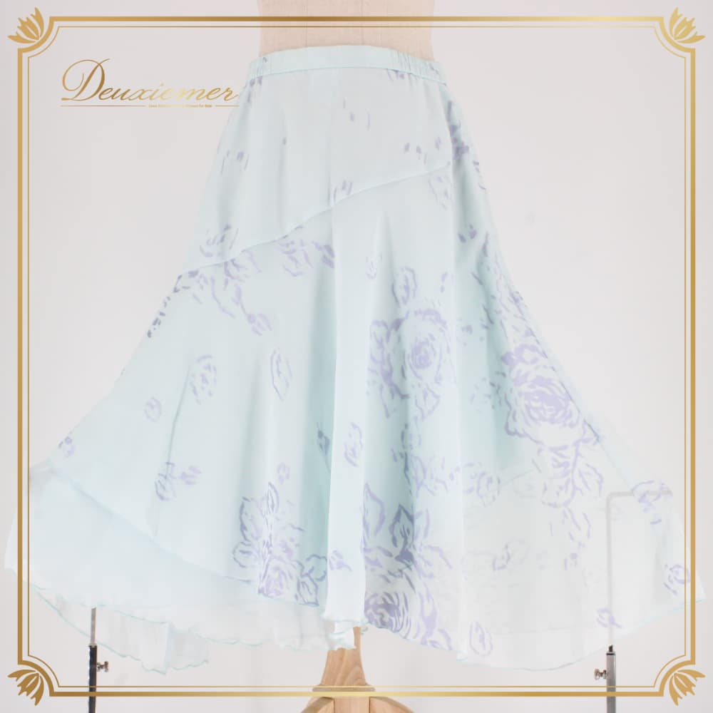 社交ダンス 衣装 U:NA ユーナ スカート レッスンウェア パープル系 ブルー系 水色 薄紫 練習着 花柄 薔薇 バラ 清楚 上品 フェミニン レッスン レディース 女性用 ライトブルー系 水色系 薄紫系 ライラックパープル 薔薇柄 バラ柄 きれいめ 大人かわいい ドレープ ふんわり カジュアル フロント 部分ファスナー 裾フレア かわいい 薄手 軽やか ポリエステル レーヨン 日本製