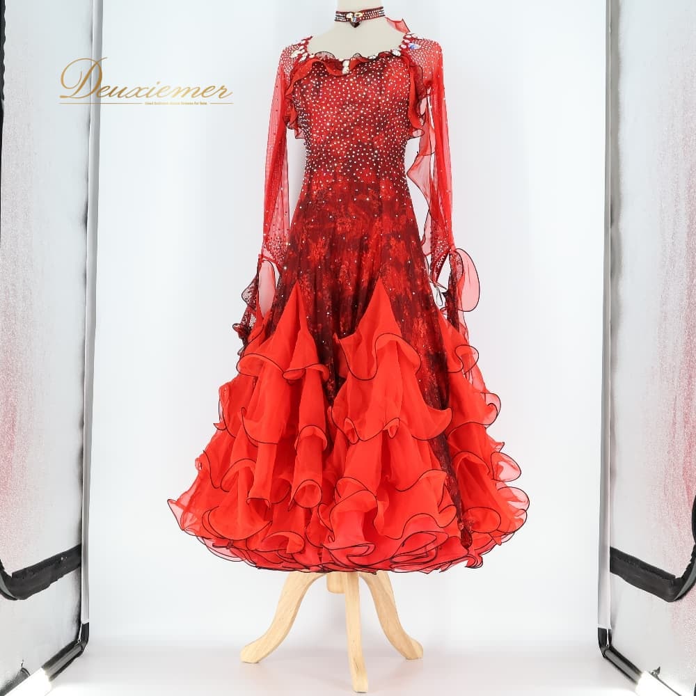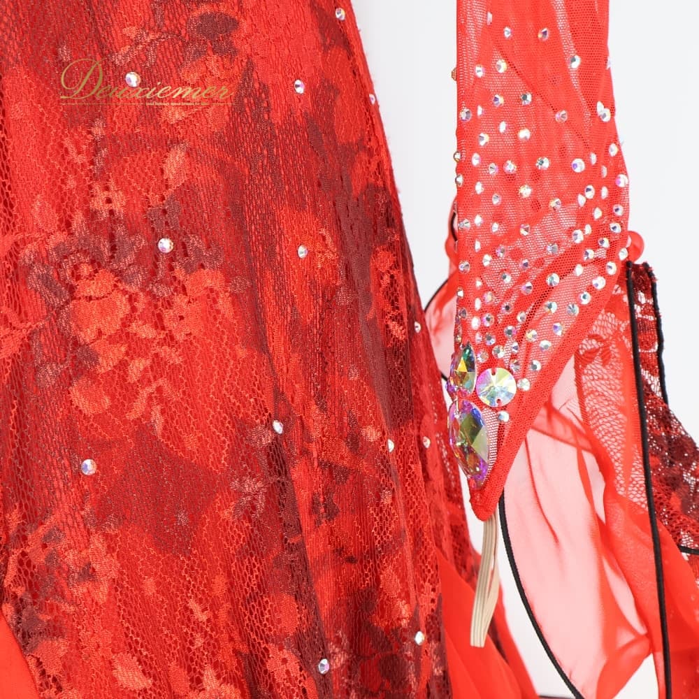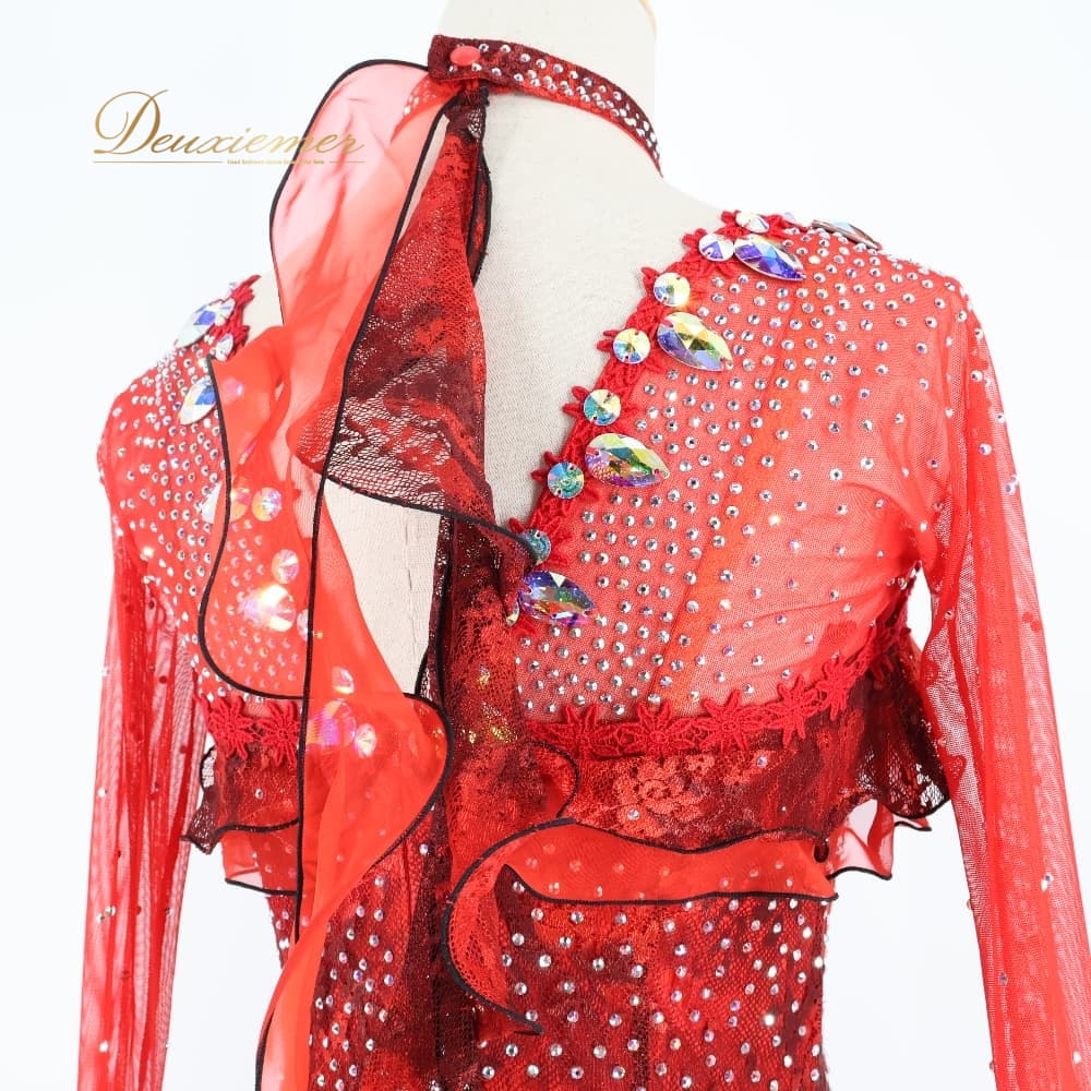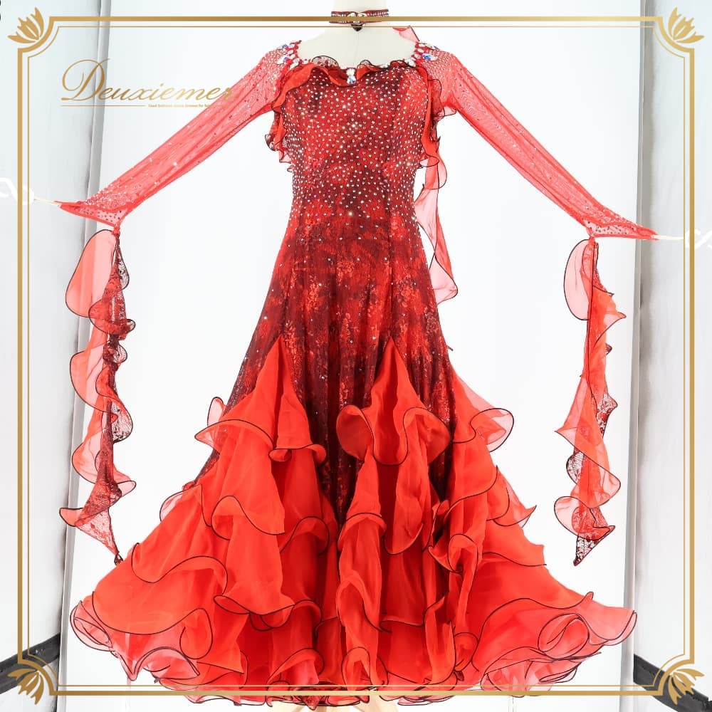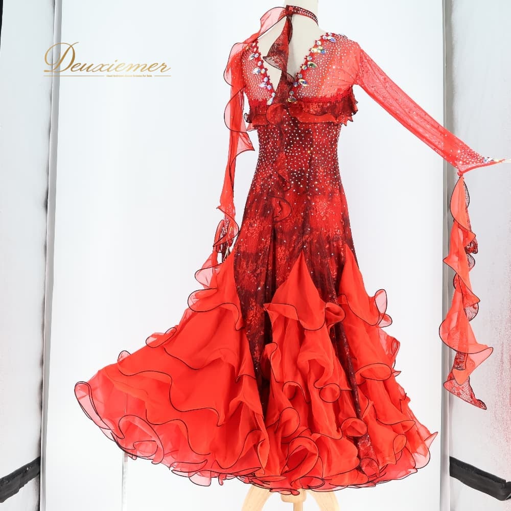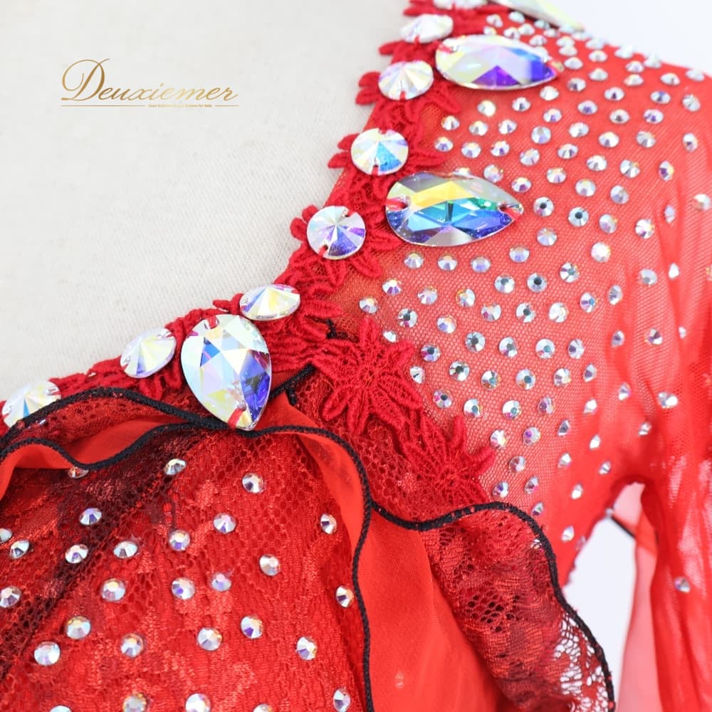 社交ダンス 衣装 Sekine セキネ 日本製 ドレス スタンダード ワンピース ブラック系 レッド系 赤 黒 フリル レース フロート デモ 競技 ダンス パーティ 発表会 スタンダードドレス 社交ダンスドレス デモンストレーション用 発表会衣装 競技ダンス衣装 パーティードレス 演奏会衣装 ダンス衣装 豪華