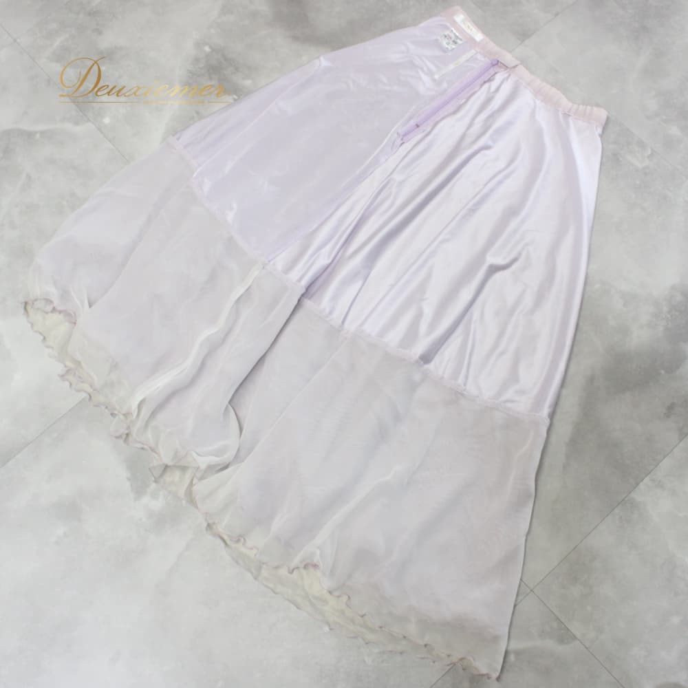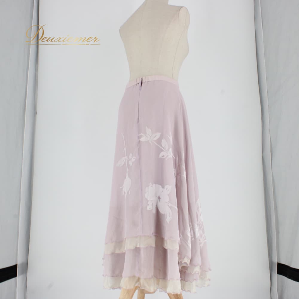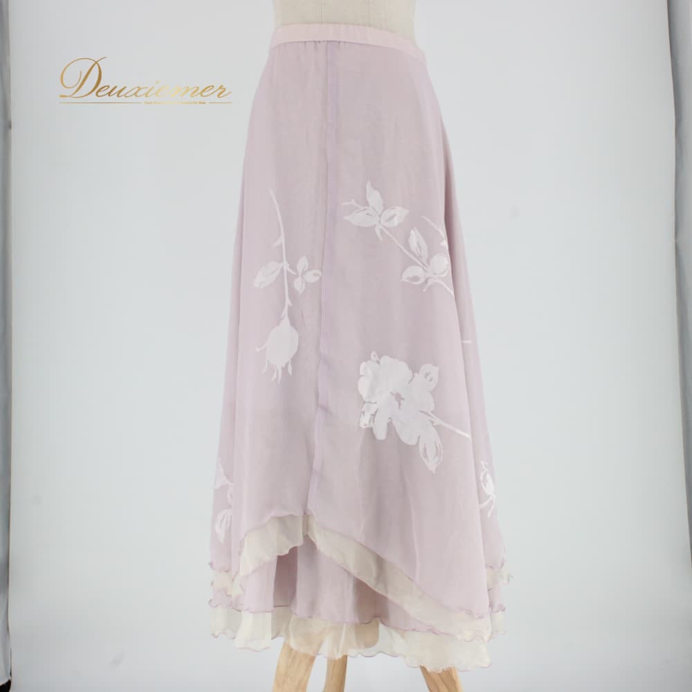社交ダンス 衣装 U:NA ユーナ スカート レッスンウェア ホワイト系 パープル系 白 薄紫 練習着 フェミニン 花柄 ボタニカル 植物 清楚 レース風 花模様 フローラル 柔らかい色 薄手 フリル裾 かわいい 大人可愛い 上品 きれいめ 華やか スカート単品 練習用 レッスン用 舞台用 セミフォーマル ダンス女子 バレエ風 ウエストファスナー 伸縮素材 春 夏 秋対応 オールシーズン 日本製 レディース 11号 87.5cm丈 フレア