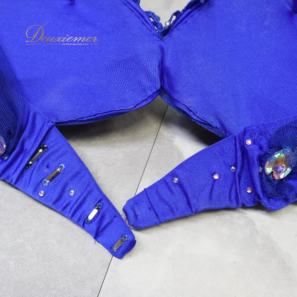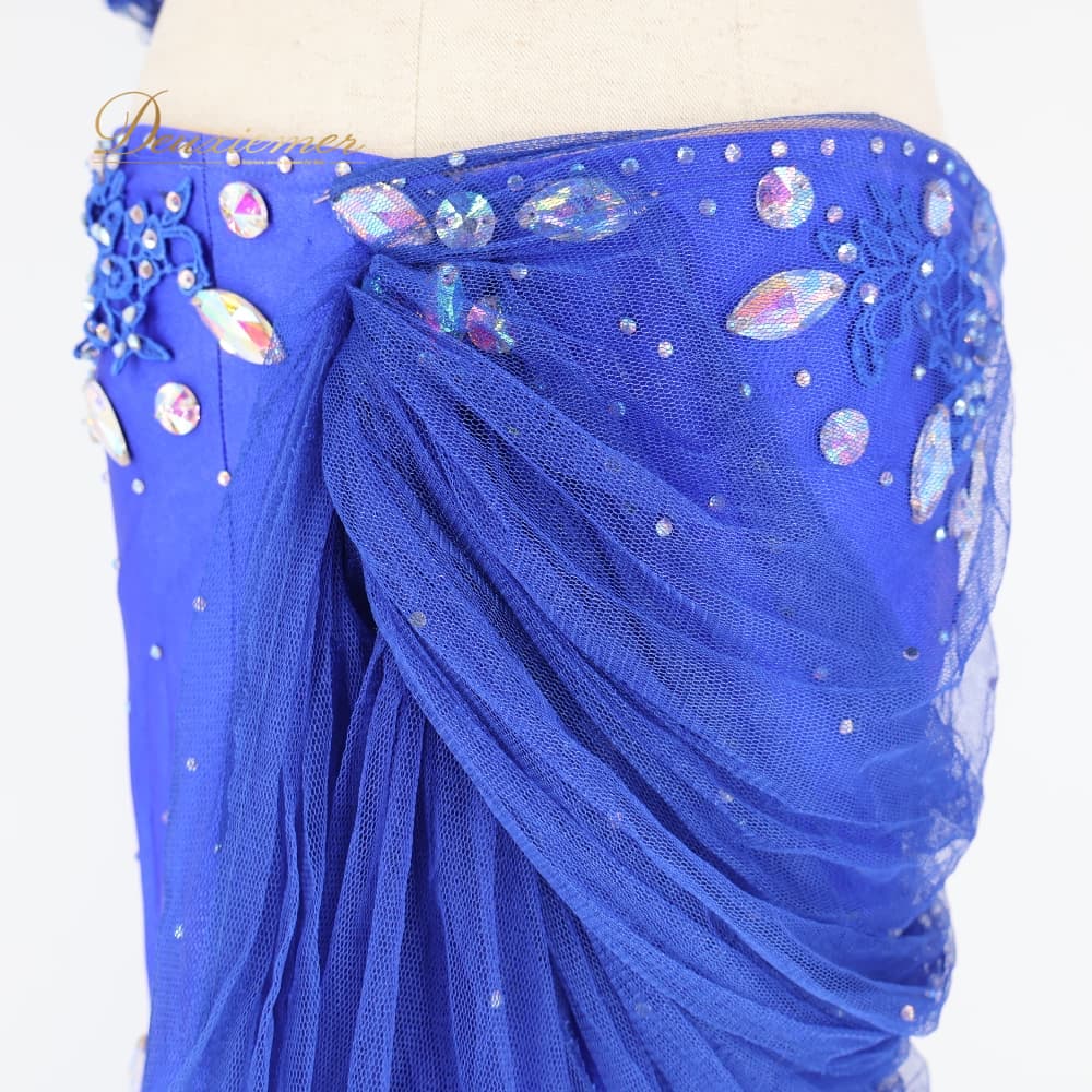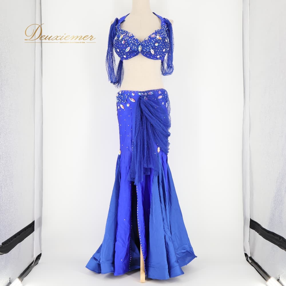 ベリーダンス 衣装 上下セット オリエンタル ブルー系 トップス スカート ラインストーン 装飾 スリット 青 キラキラ インナーパンツ 華やか かわいい ボリューム 豪華 ダンス衣装 イベント ステージ 花 フラワー