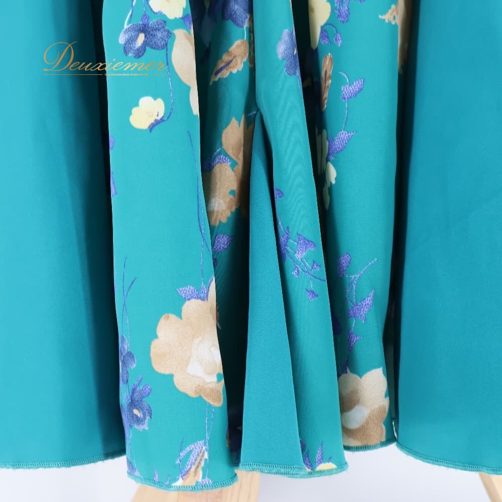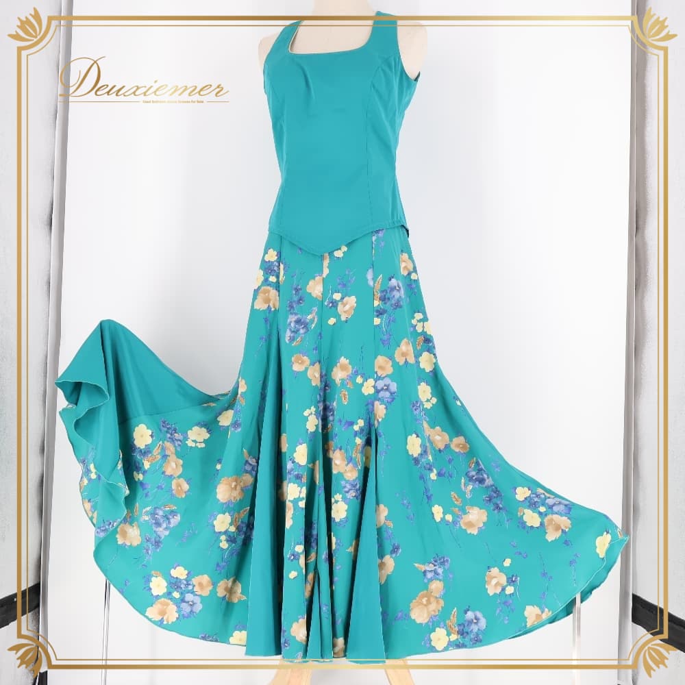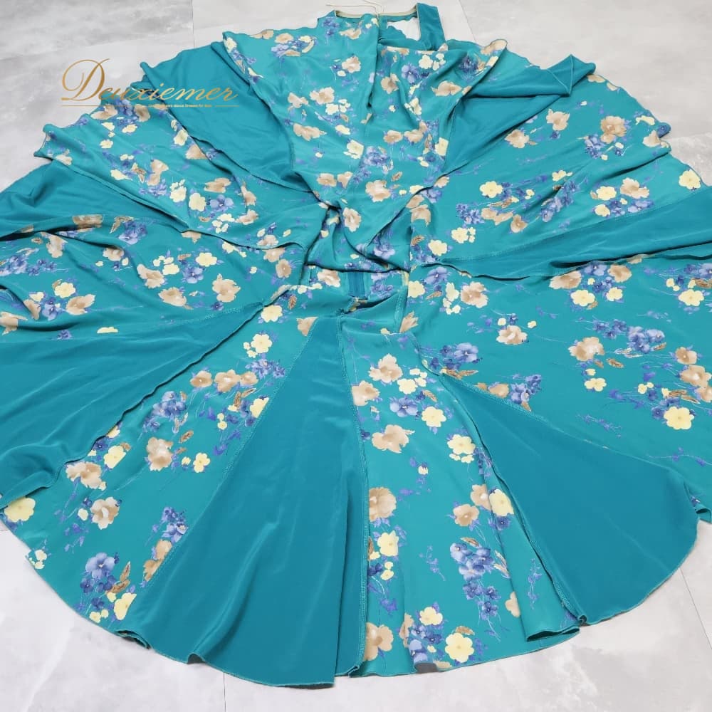 フラメンコ 衣装 ツーピース セットアップ 上下セット トップス ファルダ スカート ブルー系 グリーン系 青 緑 青緑 花柄 軽い ダンス パーティ 発表会 お洒落 ダンス衣装 舞台衣装 発表会用 演奏会衣装 かわいい ステージ衣装
