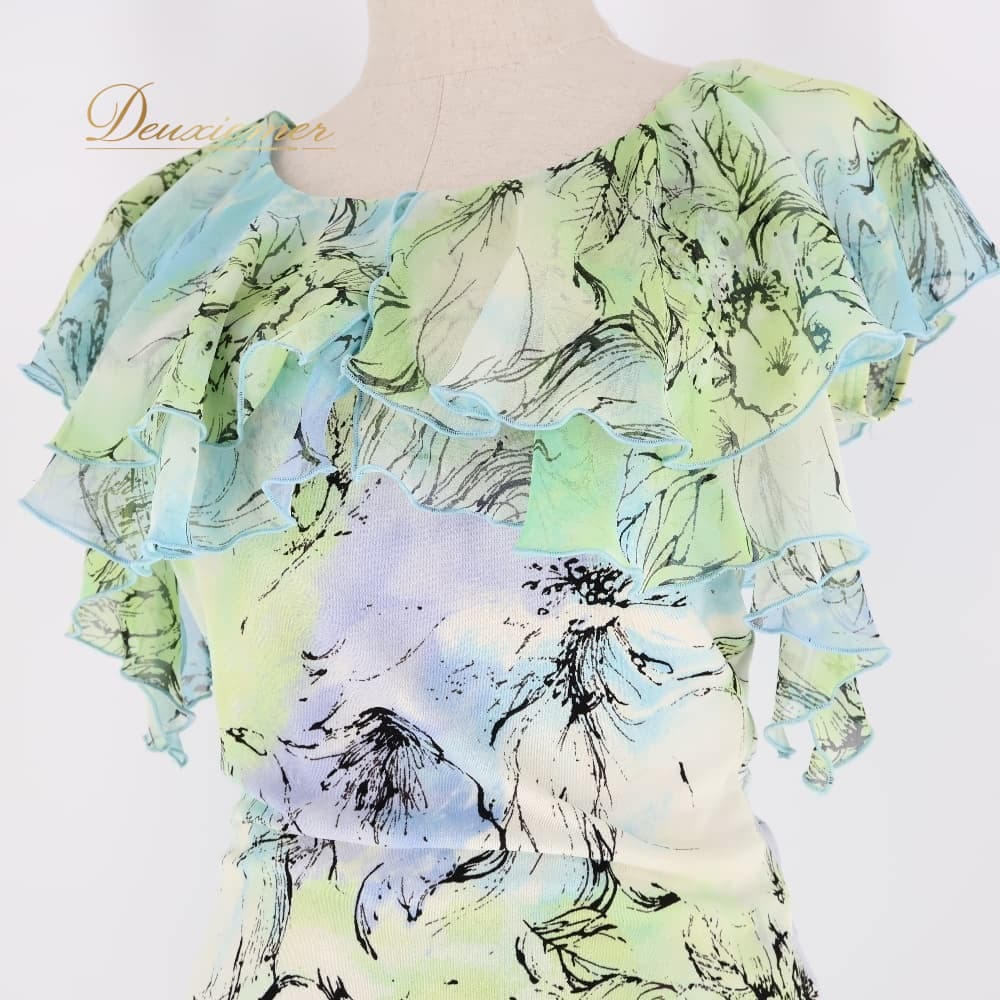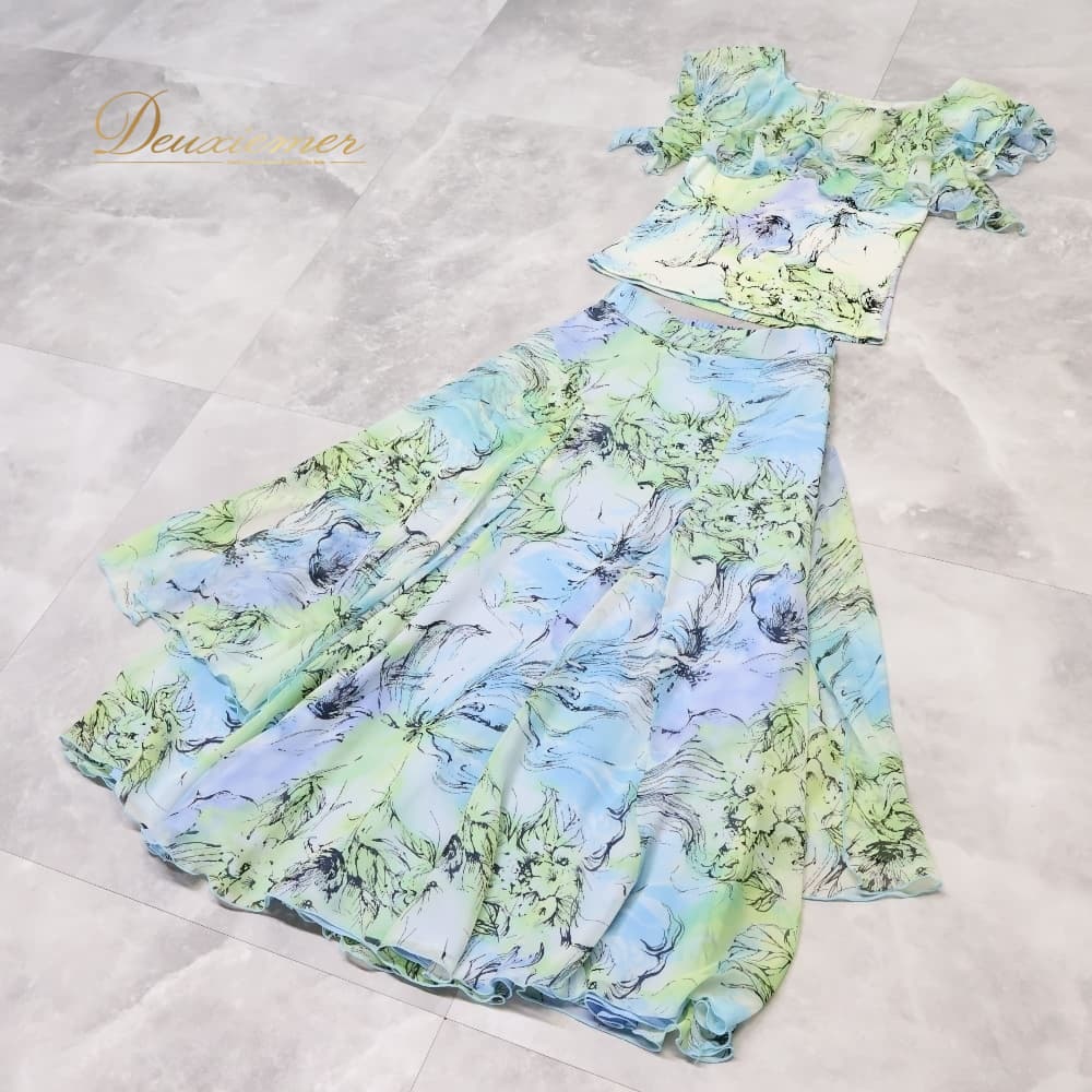 社交ダンス 衣装 Chacott チャコット 日本製 ツーピース セットアップ 上下セット スタンダード ホワイト系 ブルー系 グリーン系 黄緑 水色 トップス ブラウス スカート 花柄 レース 明るい レッスン 練習 パーティ 発表会 透け感 上品 エレガント かわいい カラフル パステル