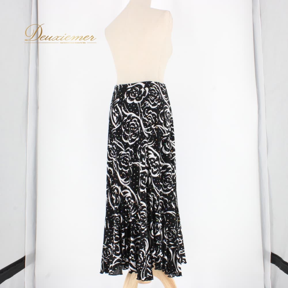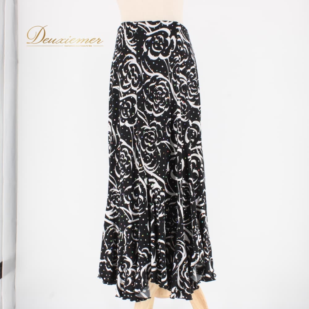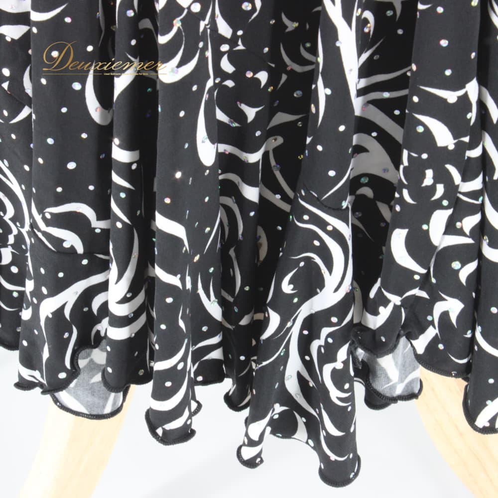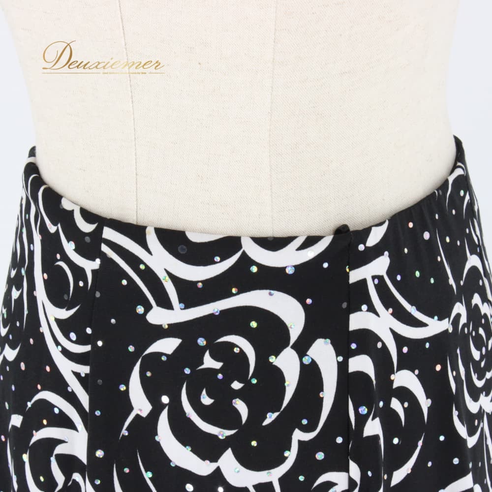 社交ダンス 衣装 スカート レッスンウェア ブラック系 ホワイト系 黒 白 ホログラム キラキラ 花柄 薔薇 バラ フォーマル 上品 練習着 黒白 刺繍風 柄プリント きらきら ラメ風 光沢 フレア ダンス衣装 ワルツ フォーマルドレス 練習用 レッスン用 ダンスレッスンウェア 大人 可愛い 花柄スカート バラ柄スカート ボリューム ラテンダンス モダン バックシャン風 体型カバー 丸襟風 クラシック モード系 ブラックドレス ホワイトドレス