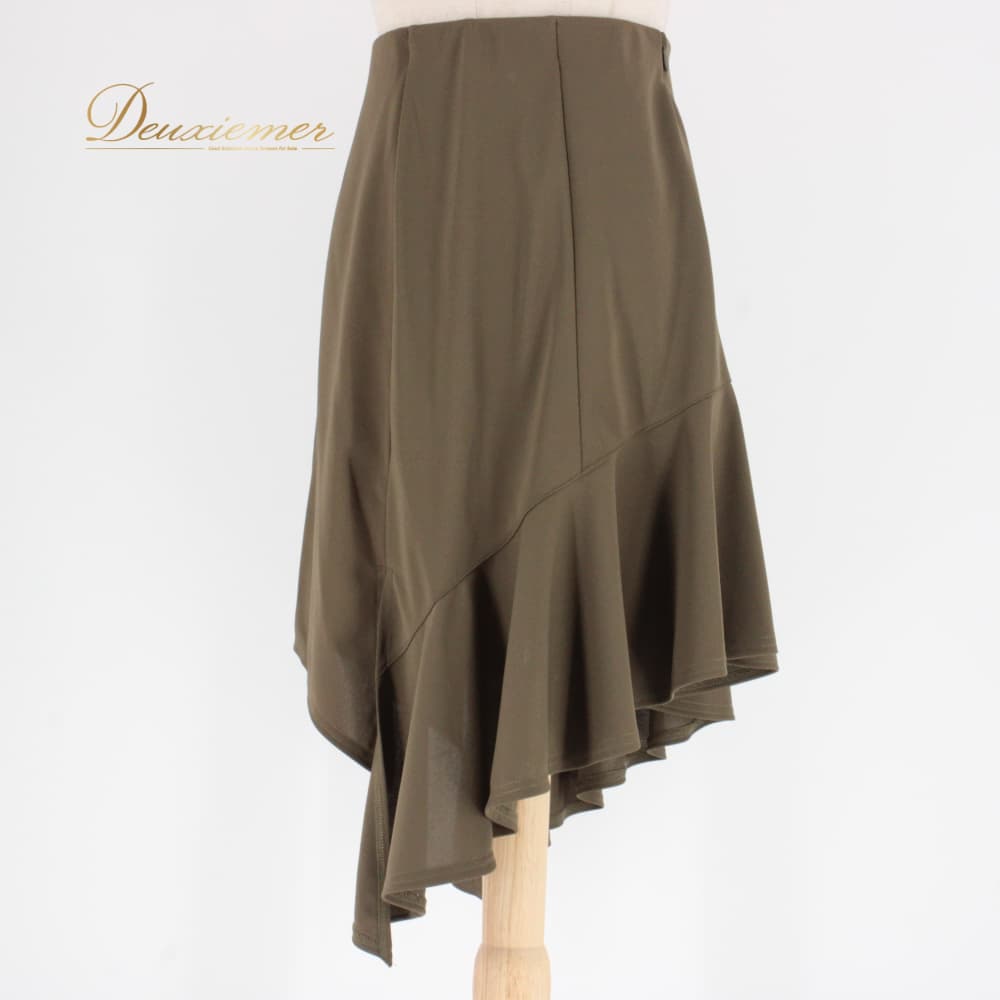 社交ダンス 衣装 Papillon パピヨン スカート レッスンウェア カーキ系 無地 シンプル ラテン 練習着 アシンメトリー 上品 気品 アシメ アシメスカート ラテン衣装 練習用スカート ダンススカート フレアスカート 重ね風 シンプルデザイン 無地スカート カーキ ステージ衣装 レッスン用 社交ダンスレッスン ラテンレッスン ダンス練習 おしゃれ スタイリッシュ モダン系 コーデ レディース ポリエステル素材 ウエストファスナー 伸縮性あり