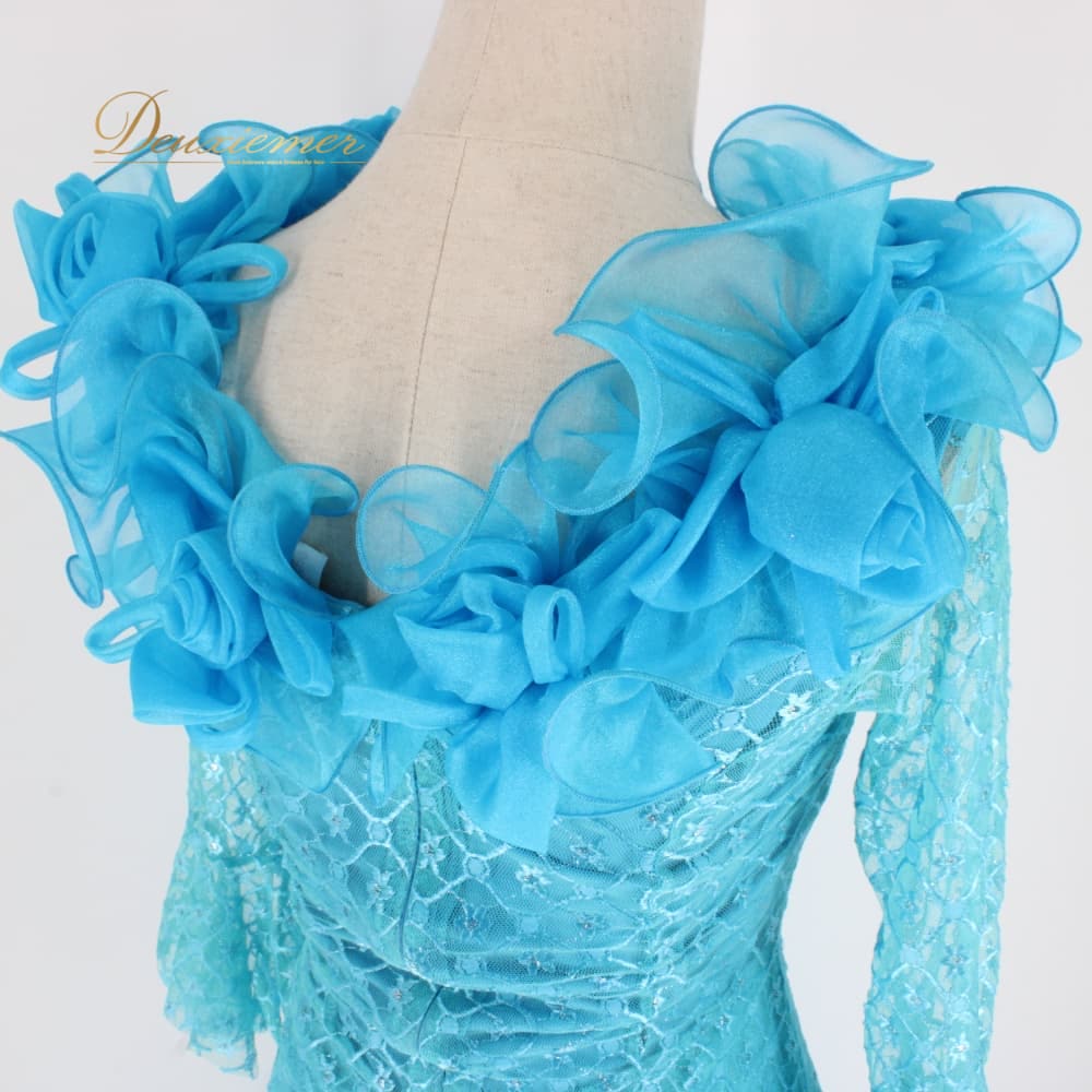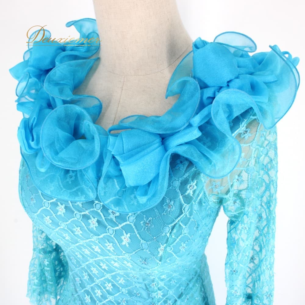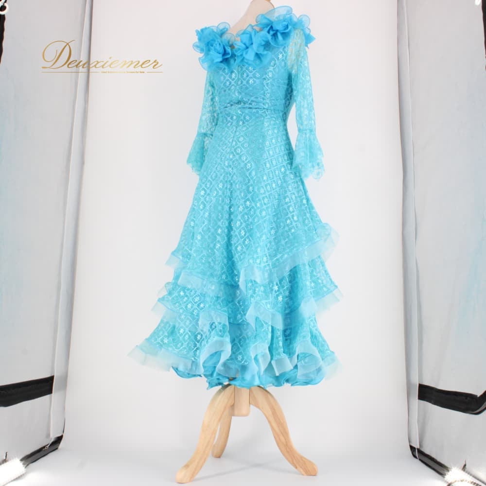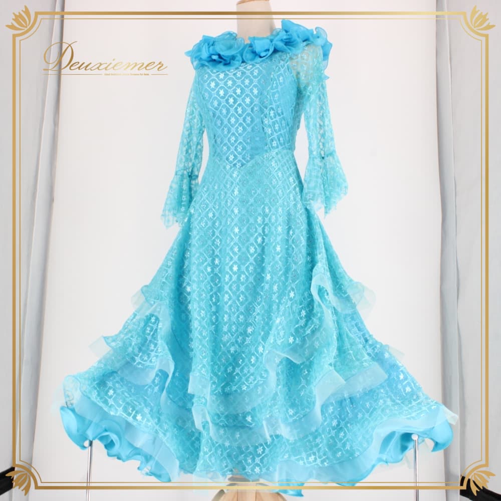 社交ダンス 衣装 prima boutique プリマブティック ドレス ワンピース スタンダード ブルー系 水色 準正装 長袖 フリル レース 花柄 競技用 スタンダード用 パーティードレス 社交ダンスドレス 花柄レース ロングスリーブ レース生地 ホースヘア 裾フリル ライトブルー 上品 きれいめ エレガント 大人 女性 レディス 背面ファスナー 伸縮性あり ポリエステル100% 胸パッドあり ウエスト切替風 ドロップショルダー風 ロング丈 120cm フォーマル レッスン フラメンコ風風 4F 競技