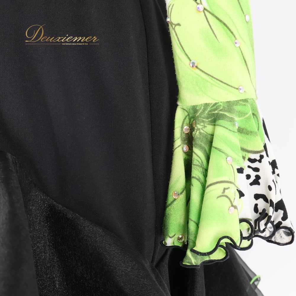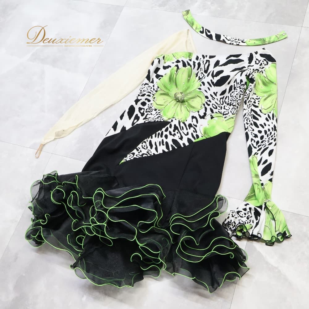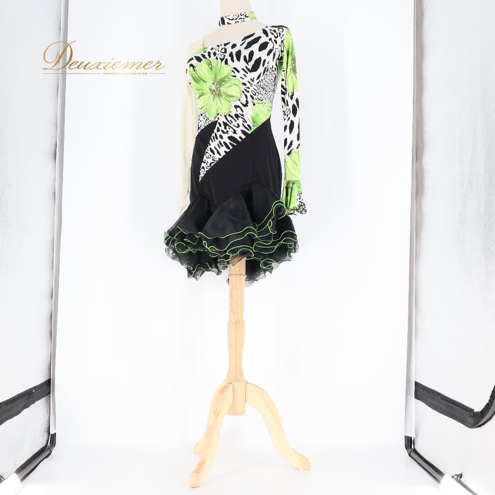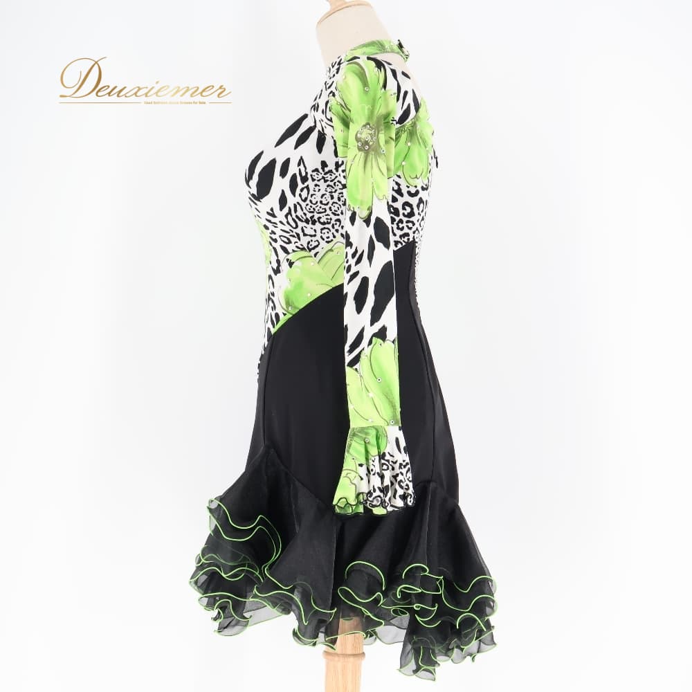 社交ダンス 衣装 in the MOOD インザムード 日本製 ドレス ワンピース ラテン ブラック系 ホワイト系 グリーン系 白 黒 黄緑 ダンス パーティ 発表会 フリル レース デモ 競技 軽い 柄 模様 上品 パーティードレス デモ用 競技用 発表会用