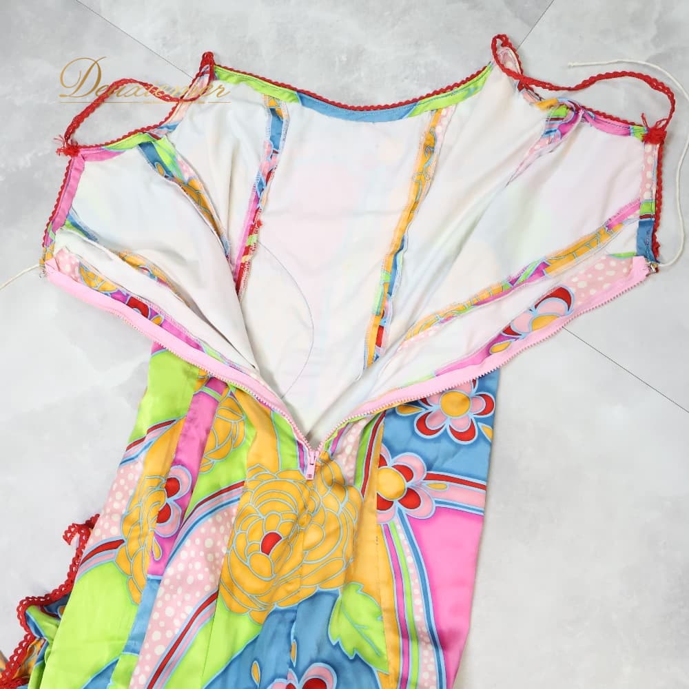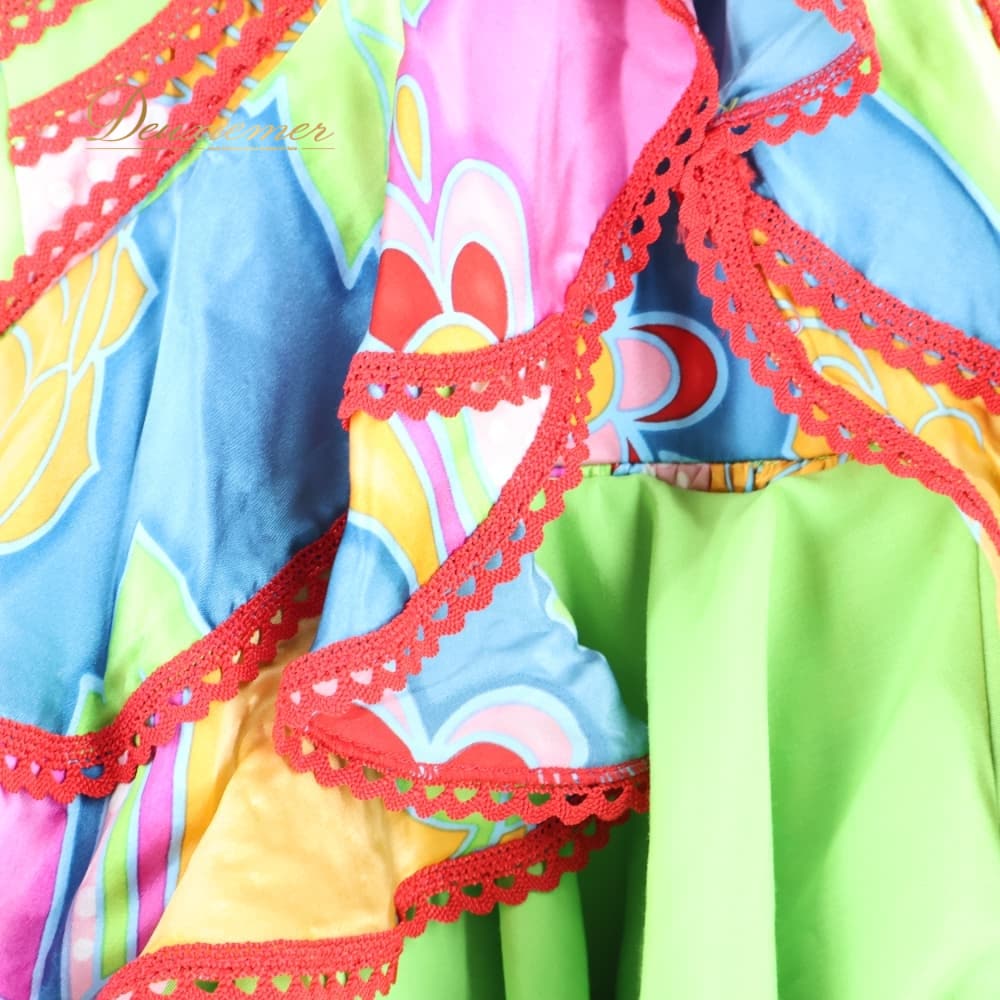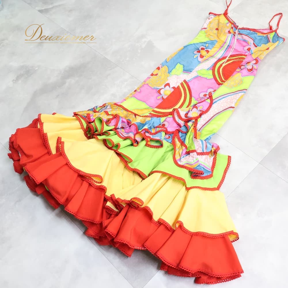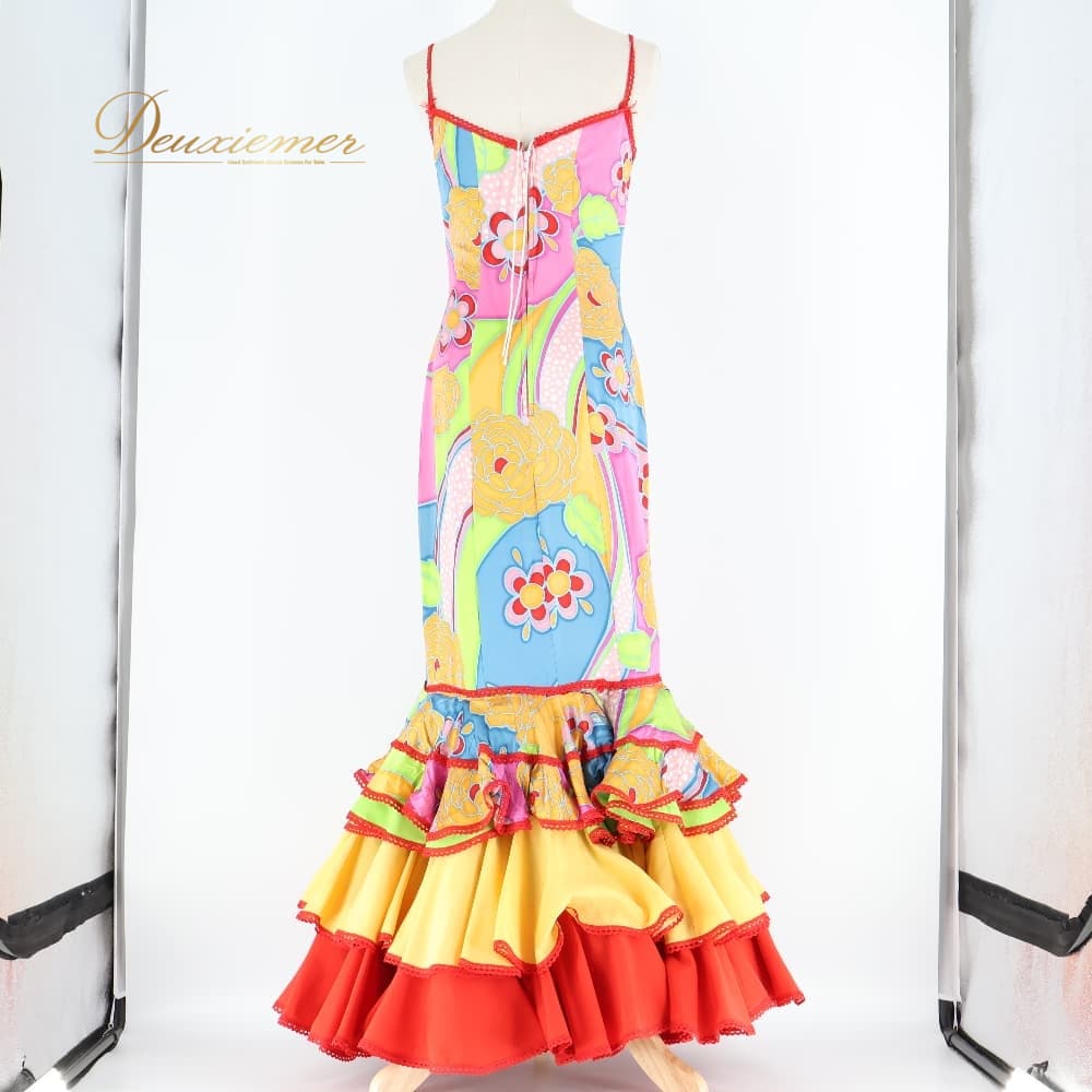 フラメンコ 衣装 ドレス ワンピース レッド系 ピンク系 ブルー系 グリーン系 イエロー系 オレンジ系 赤 黄色 オレンジ 青 水色 カラフル ボランテ フリル 柄 模様 パーティ 発表会 ボリューム ダンス衣装 ステージ衣装 舞台衣装 発表会衣装