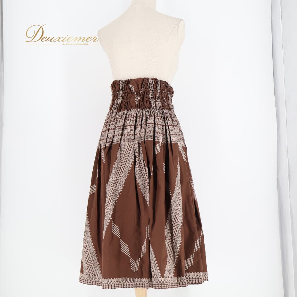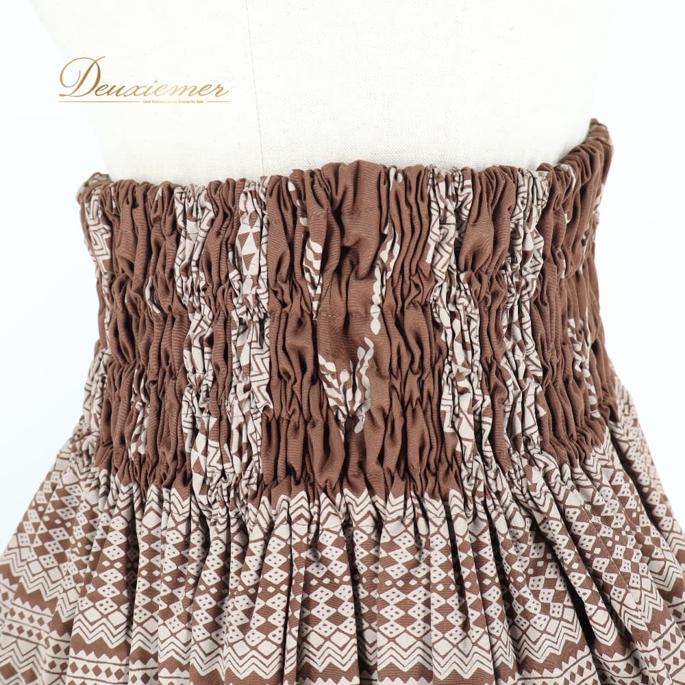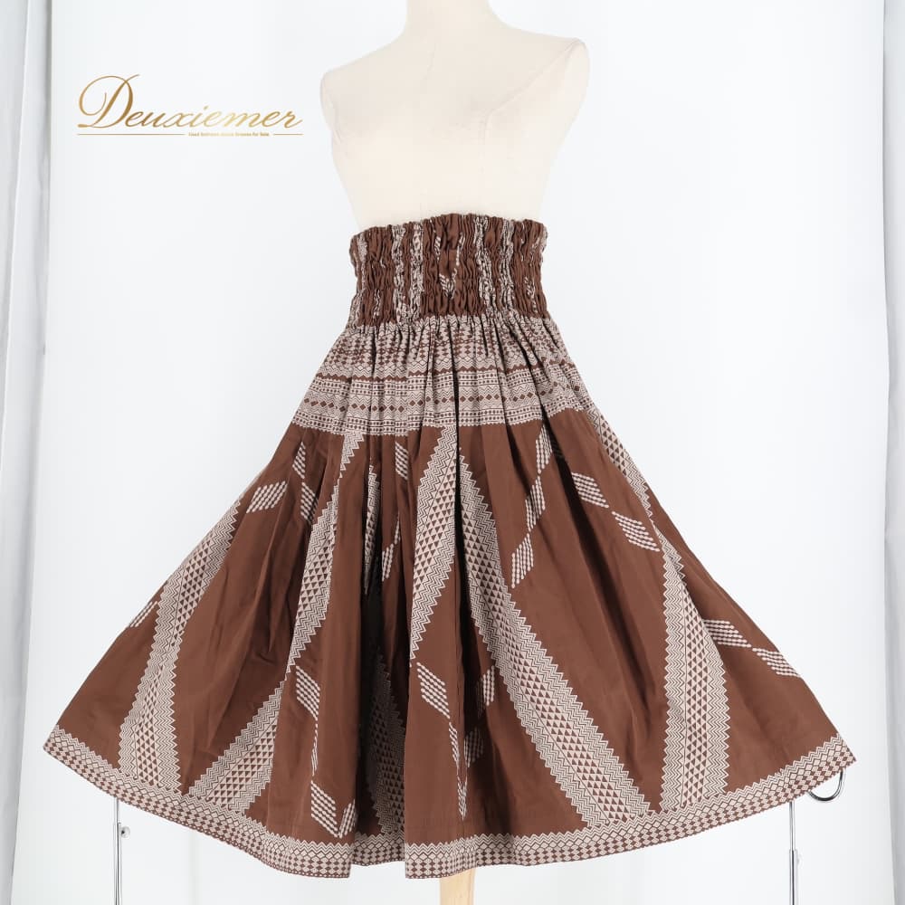#パウスカート #カヒコ柄 #フラダンス #フラ #ハワイアン #ハワイ #ブラウン #ベージュ #フレアシルエット #ウエストゴム #ウエスト伸縮 #快適 #大人可愛い #上品 #伝統柄 #手作り風 #ダンス衣装 #発表会 #普段使い #ENUTSU