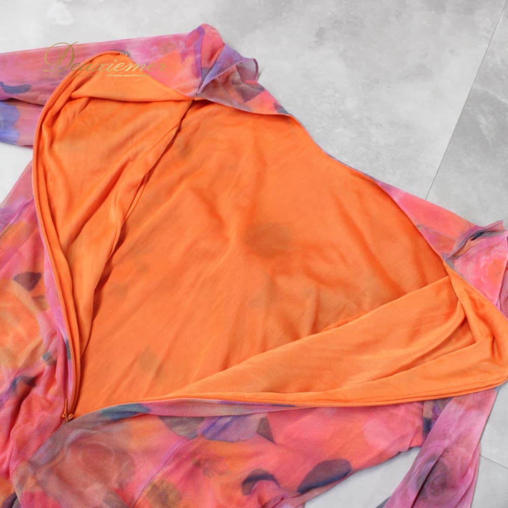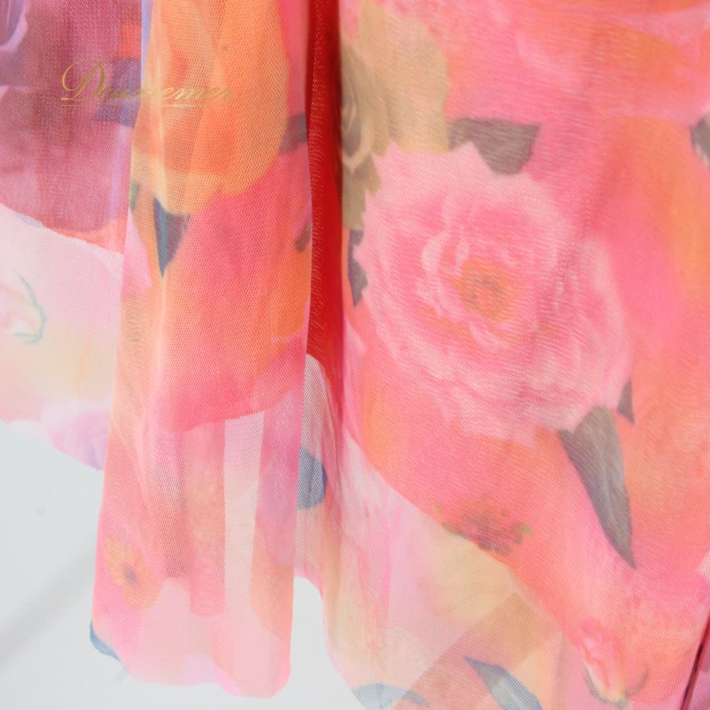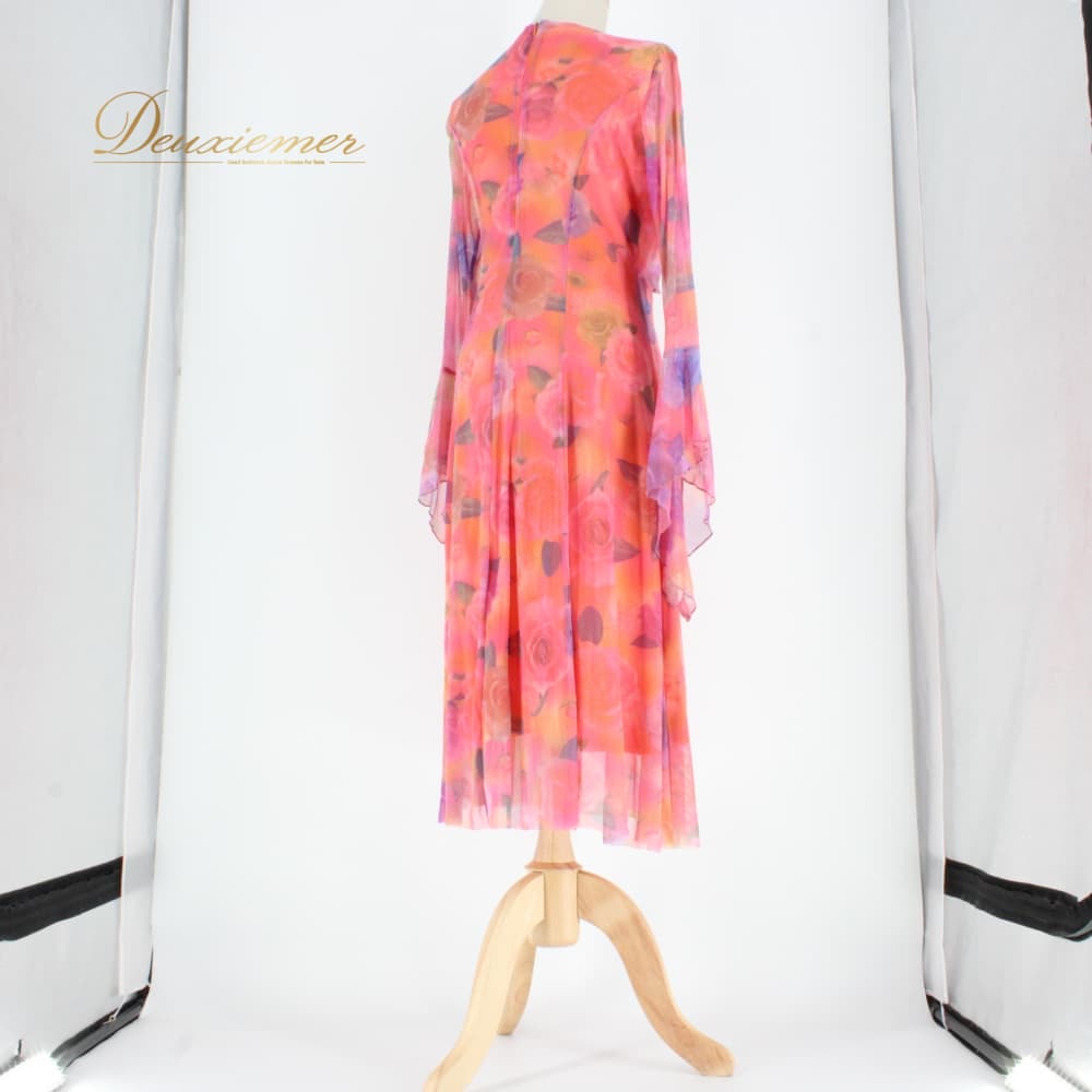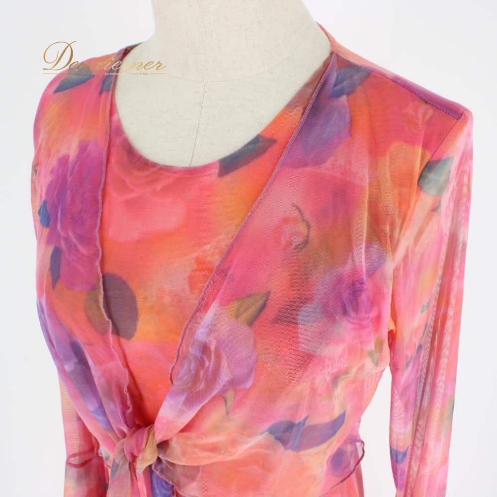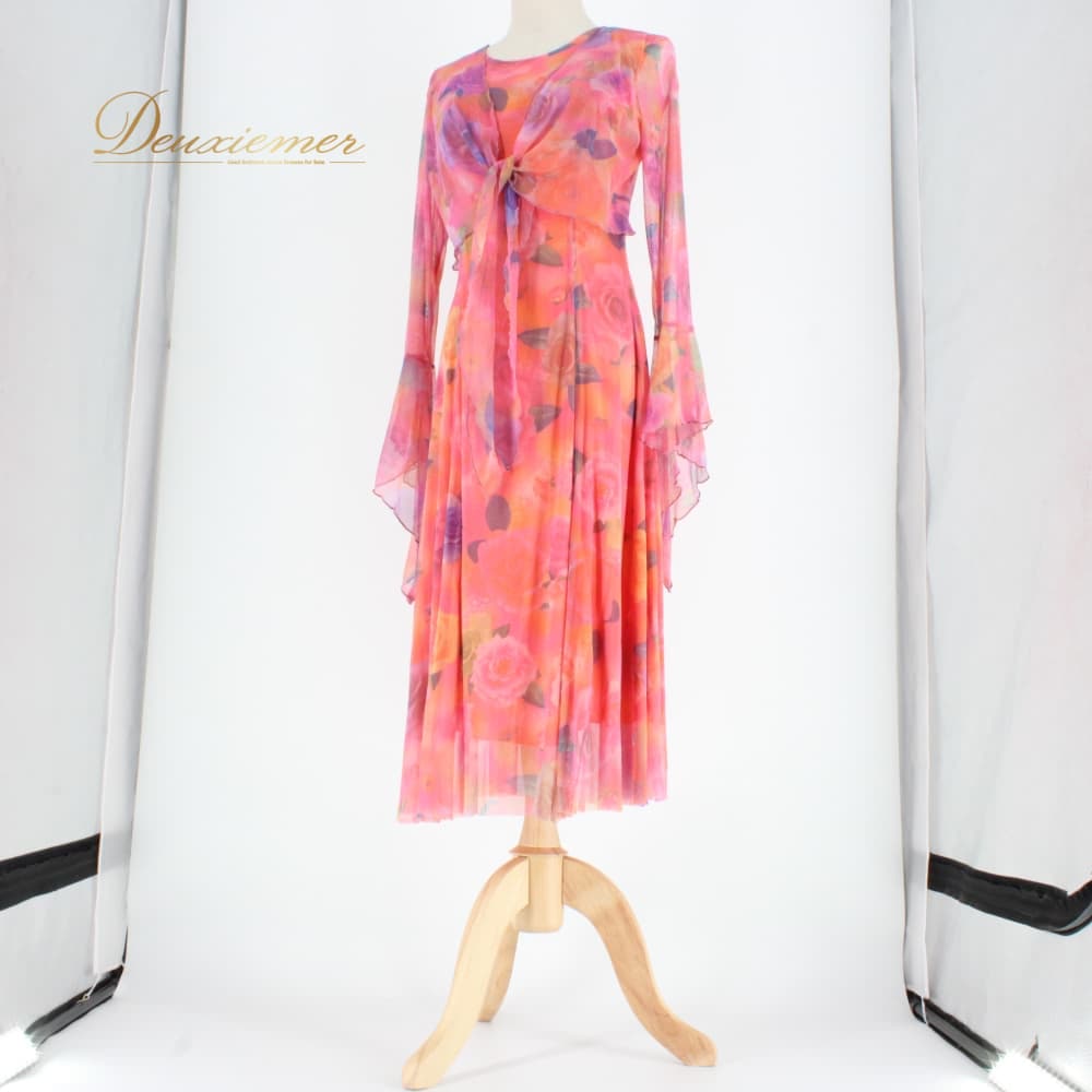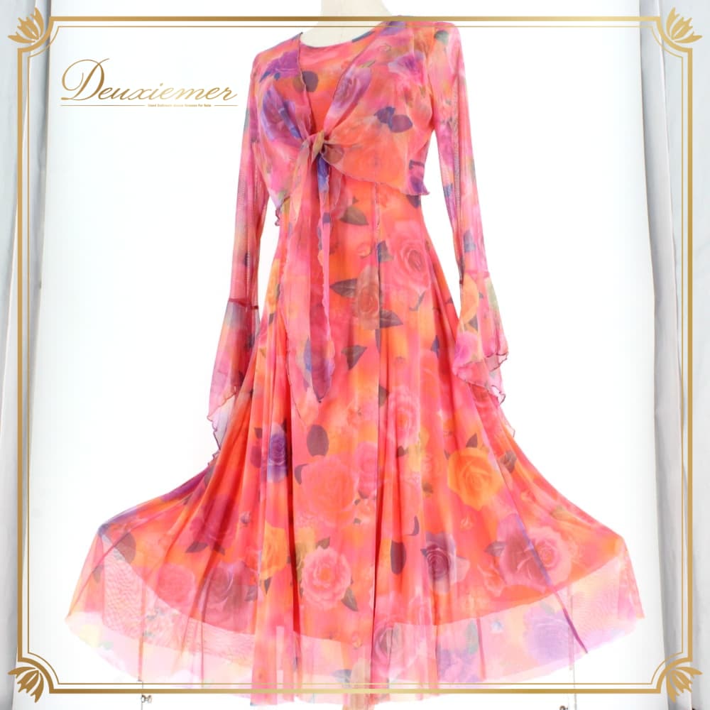 社交ダンス 衣装 ICHIOKU イチオク ワンピース ドレス スタンダード ピンク系 オレンジ系 ステージ衣装 カラオケ 花柄 レース 薔薇 バラ スタンダードドレス レディース ワンピースドレス 社交ダンスワンピース フラワー柄 バラ柄 ローズ柄 ピンクオレンジ 透け感 シフォン風 サイドファスナー バックファスナー 長袖 フレアスカート ひざ丈 上品 エレガント ステージ用 ダンス コンサート 発表会 ポリエステル素材 練習用 素敵 ダンスドレス 9号相当 伸縮あり 女性用