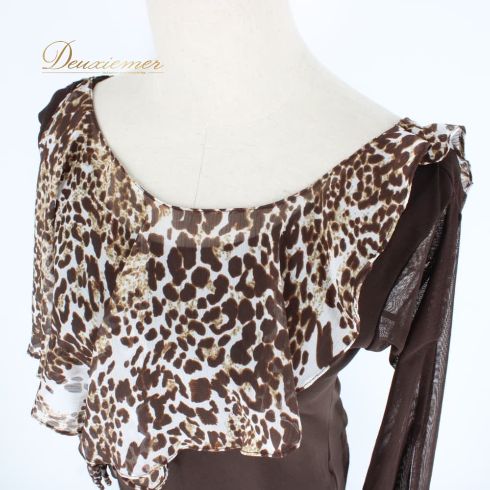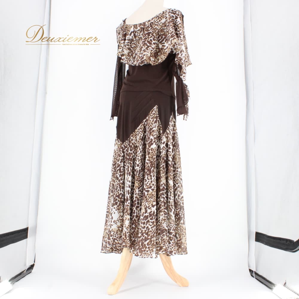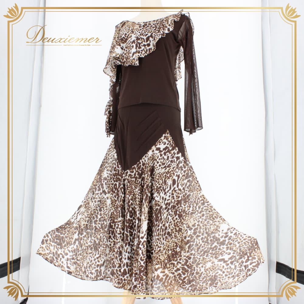 社交ダンス 衣装 create-sun クリエイトサン ツーピース スタンダード ホワイト系 ブラウン系 茶色 白 上下セット セットアップ スカート トップス 長袖 ヒョウ柄 アニマル柄 ロングスカート ロング丈 ダンスパーティー ステージ衣装
