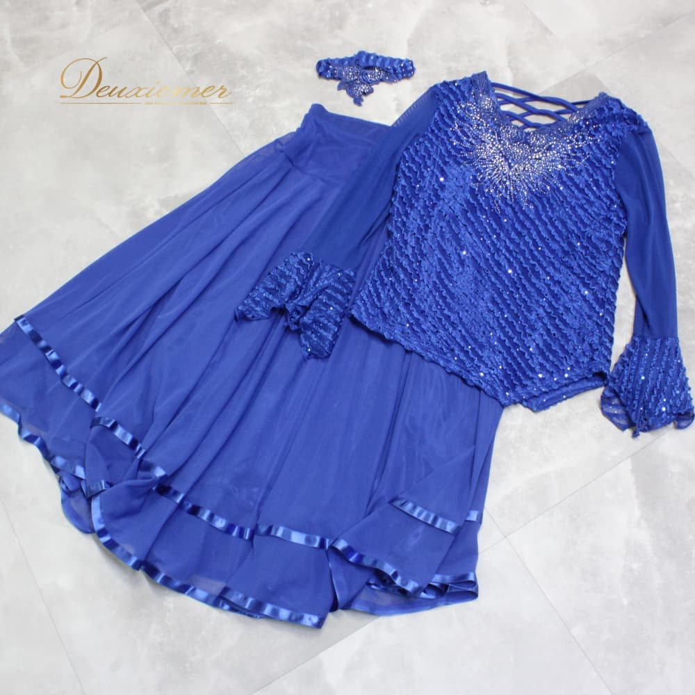 社交ダンス 衣装 Avivare アビバーレ ツーピース スタンダード ブルー系 青 チョーカー ラインストーン レース セットアップ 上下セット トップス スカート レッスンウェア 練習着 ダンスパーティー ステージ衣装 発表会 上品 華やか エレガント 光沢感