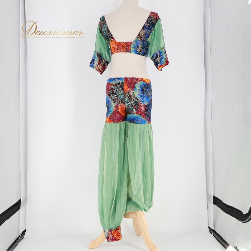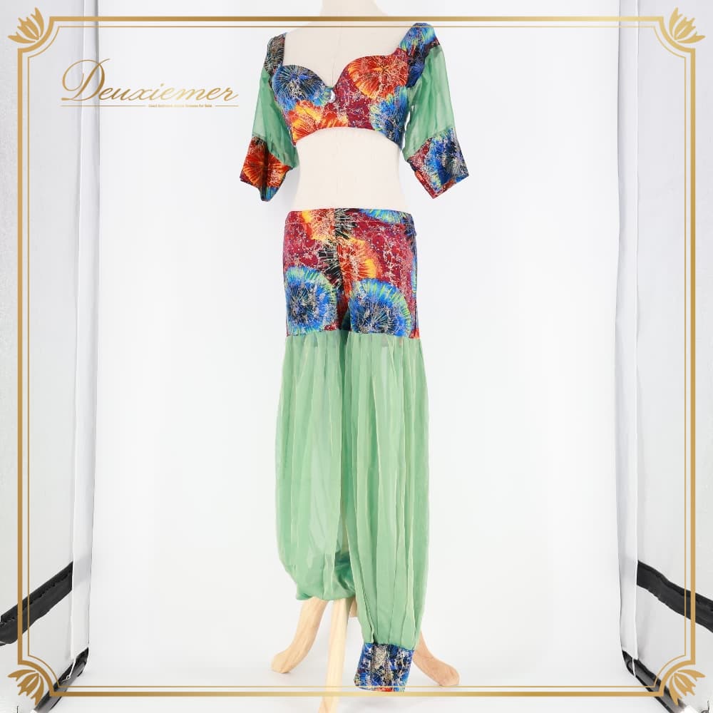 ベリーダンス 衣装 ツーピース レッスンウェア グリーン系 トップス パンツ 華やか レッスン 緑 赤 青 紫 かわいい ボトムス ズボン ダンス衣装 セットアップ 上下セット 透け感 ラインストーン キラキラ ラメ レッド系 パープル系 ブルー系 オレンジ系