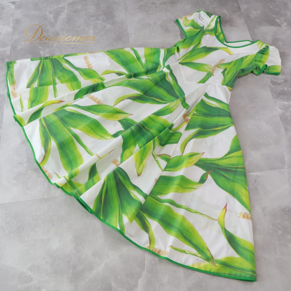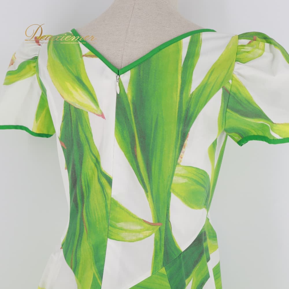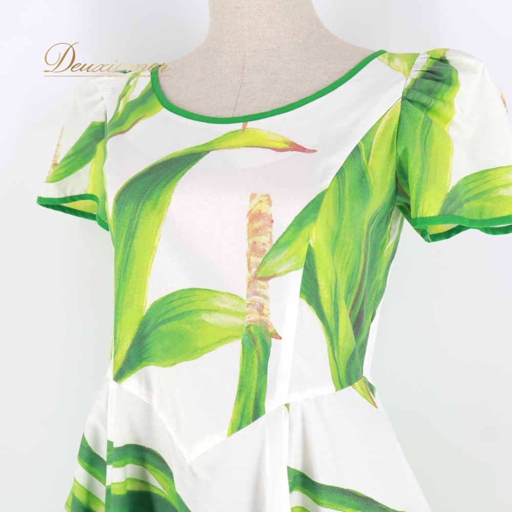 フラダンス 衣装 MENEHUNE PLANTETION メネフネプランテーション ワンピース ドレス ホワイト系 植物柄 ハワイアンプリント アロハ フラ ダンス レッスン 練習 半袖 フレア 白 緑 黄緑 黄 華やか 鮮やか かわいい おしゃれ さわやか 上品 グリーン系 イエロー系