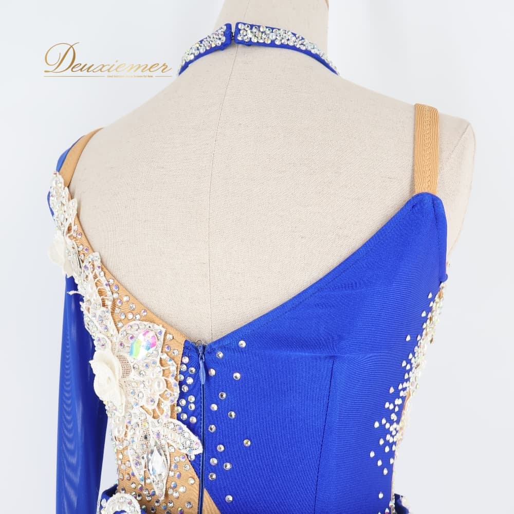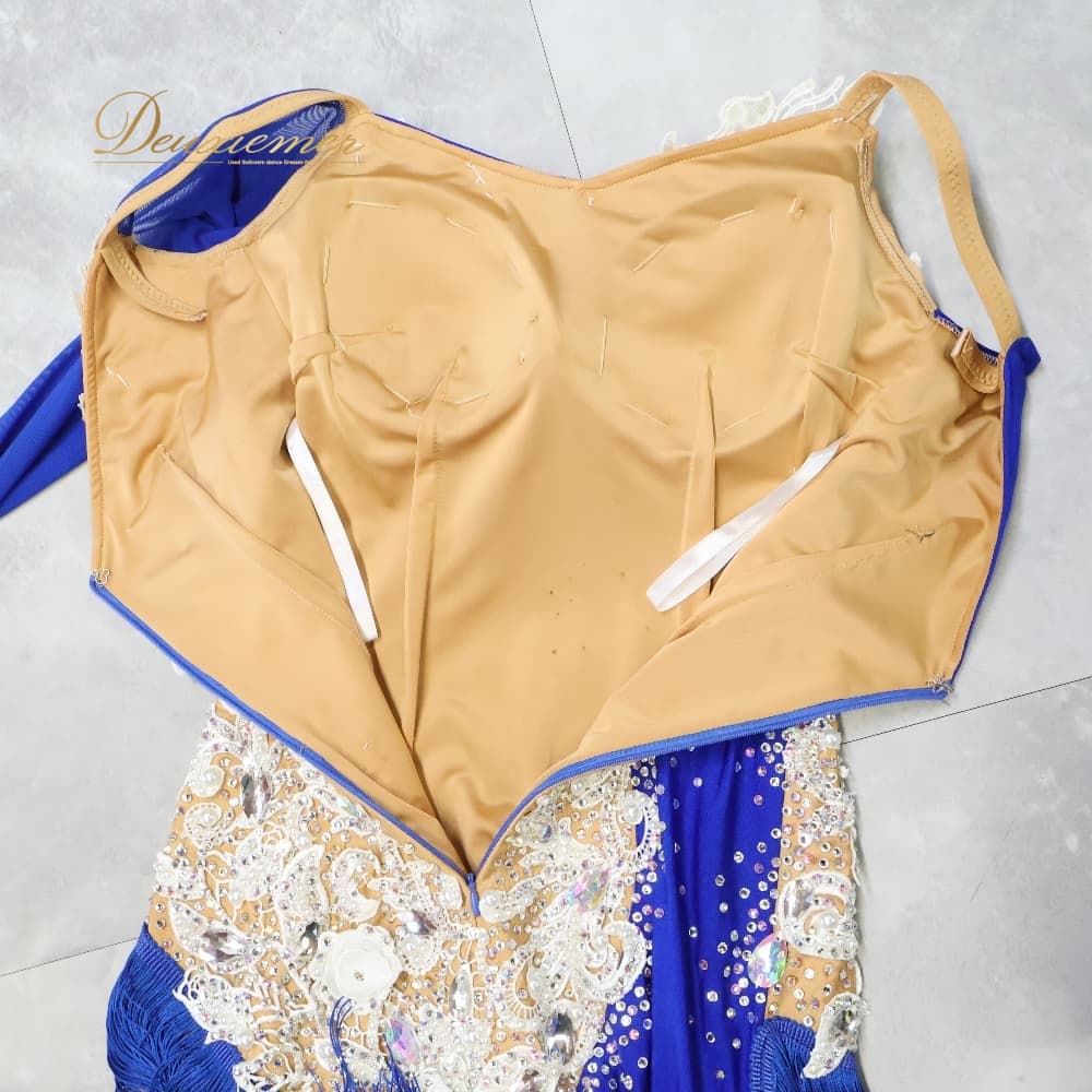 社交ダンス 衣装 ドレス ワンピース ラテン ホワイト系 ブルー系 白 青 フリンジ デモ 競技 ダンス パーティ 発表会 豪華 華やか デモンストレーション きらきら ダンス衣装 競技用