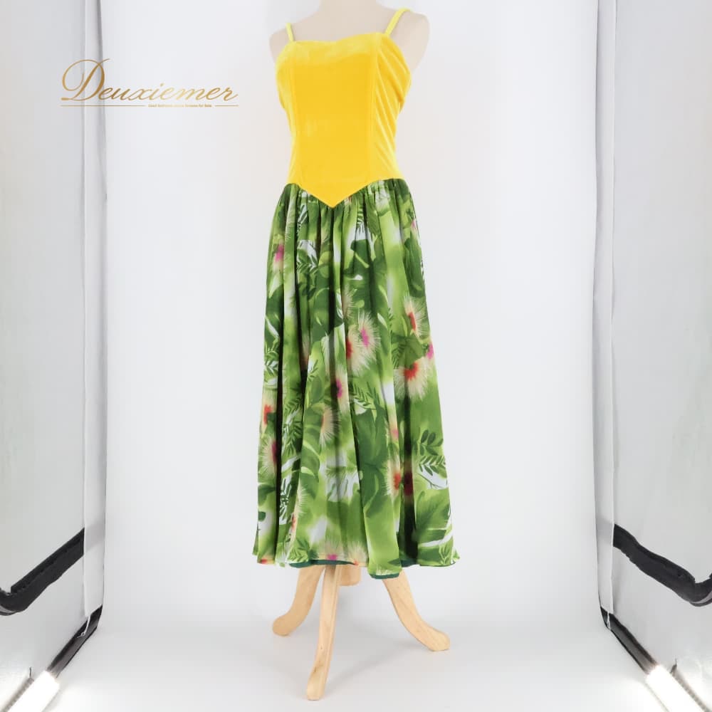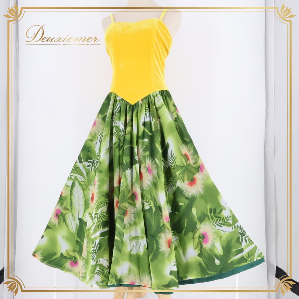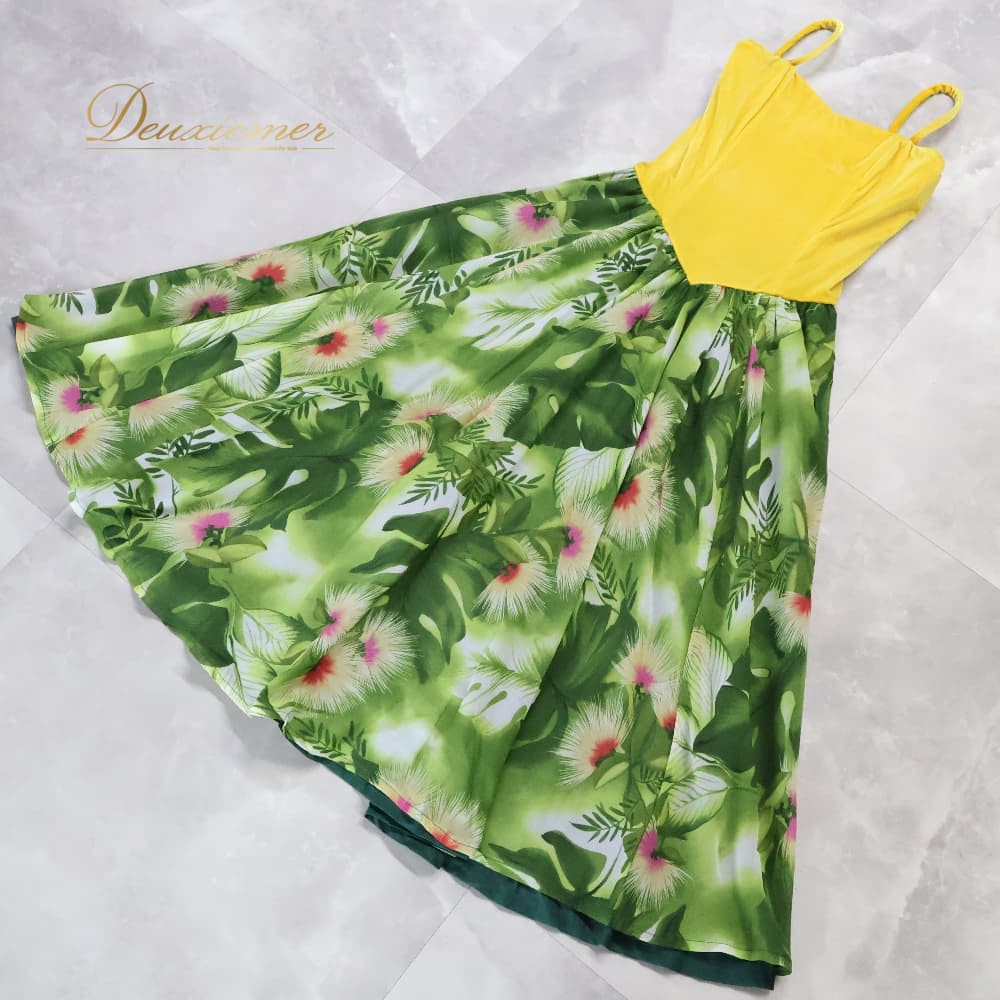 フラダンス 衣装 u'ino! uino ワンピース ドレス イエロー系 ハワイ製 ベロア キャミソールドレス ひらひら かわいい 華やか 鮮やか 明るい 爽やか 黄 緑 ハワイアン アロハ ハワイアンプリント フラ ダンス レッスン 練習 フラワンピース